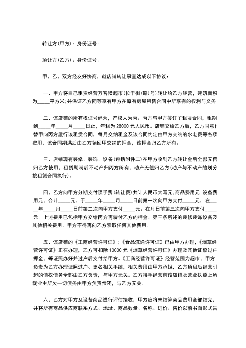 一、甲方将自己租赁经营万客隆超市(位于街(路)号)转让给乙方经营,建筑面积为_____平方米;并保证乙方同等享有甲方在原有房屋租赁合同中所享有的权利与义务。
