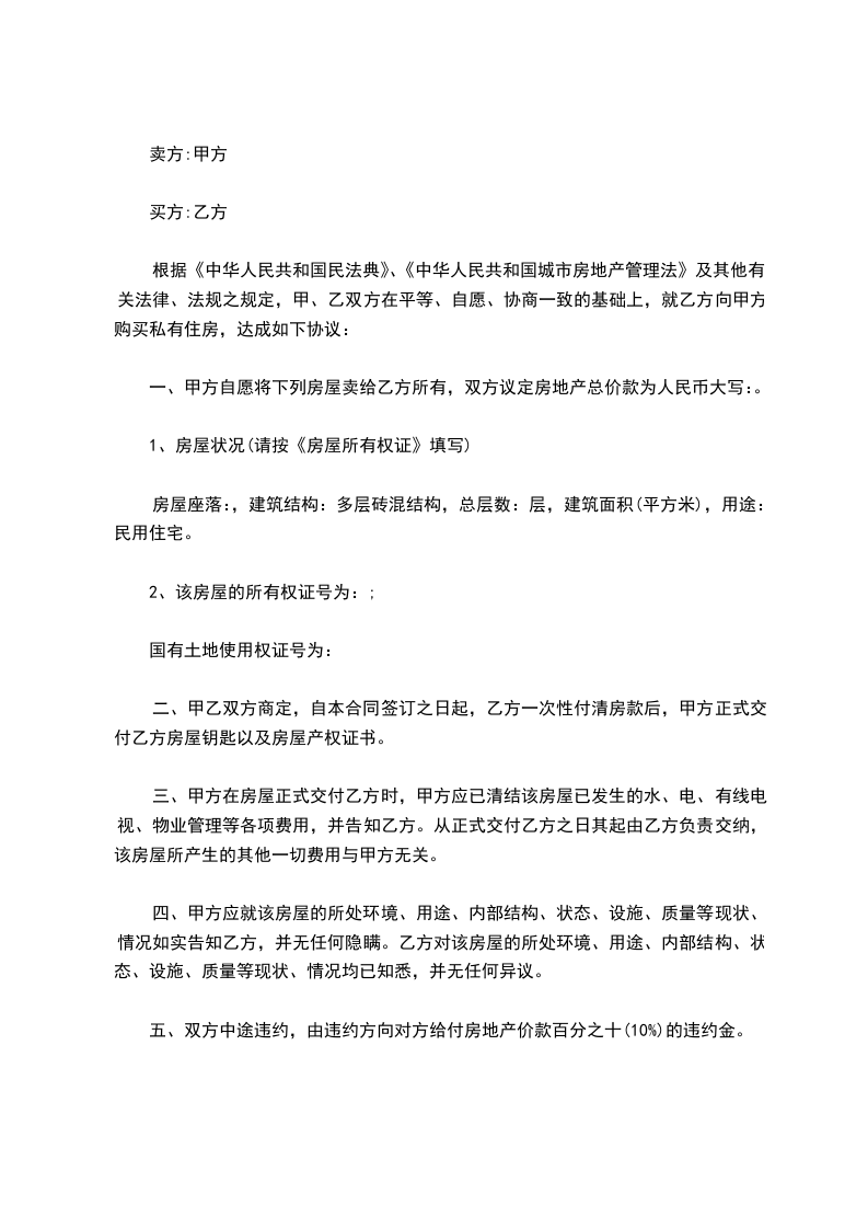 根据《中华人民共和国民法典》、《中华人民共和国城市房地产管理法》及其他有关法律、法规之规定,甲、乙双方在平等、自愿、协商一致的基础上,就乙方向甲方购买私有住房,达成如下协议: