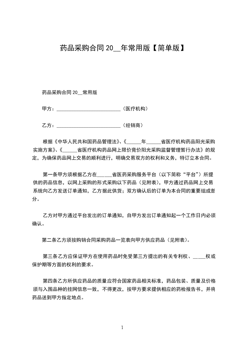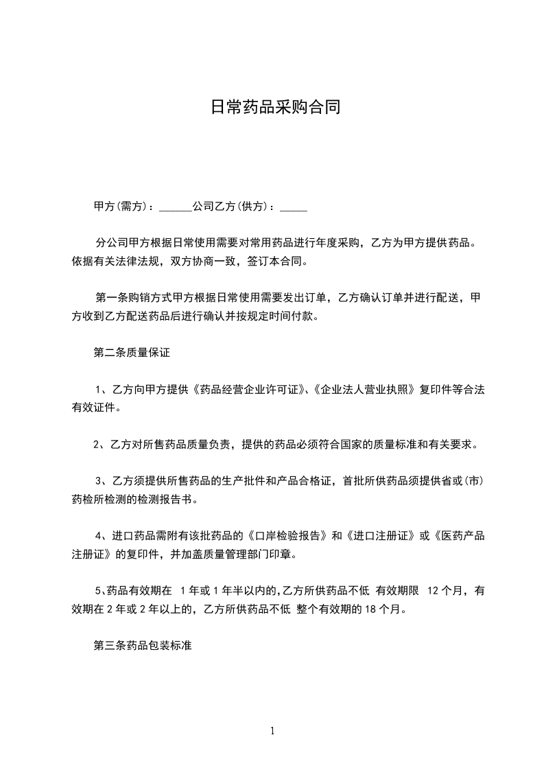 甲方根据日常使用需要对常用药品进行年度采购,乙方为甲方提供药品。依据有关法律法规,双方协商一致,签订本合同。