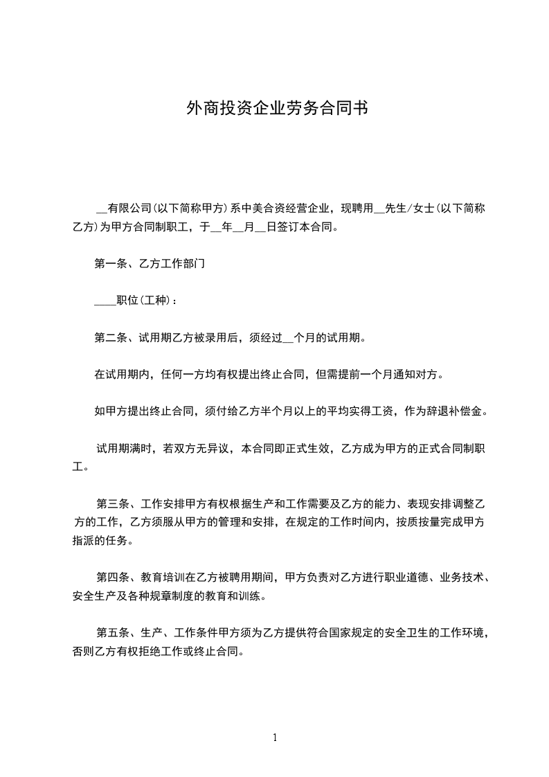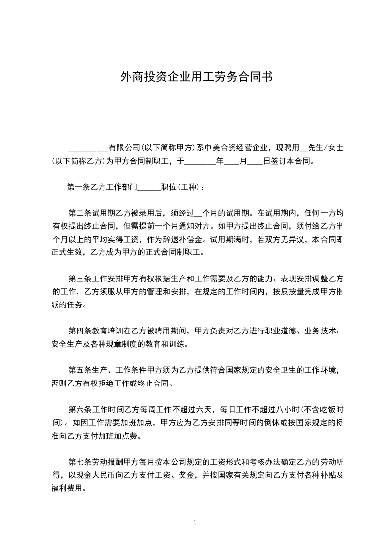 __________有限公司(以下简称甲方)系中美合资经营企业,现聘用__先生/女士(以下简称乙方)为甲方合同制职工,于________年____月____日签订本合同。