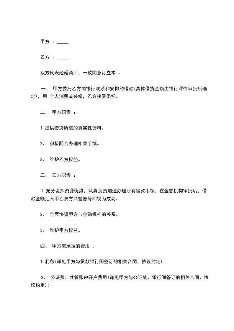 一、甲方委托乙方向银行联系和安排约借款(具体借贷金额由银行评估审批后确定),用于个人消费或装修,乙方接受委托。