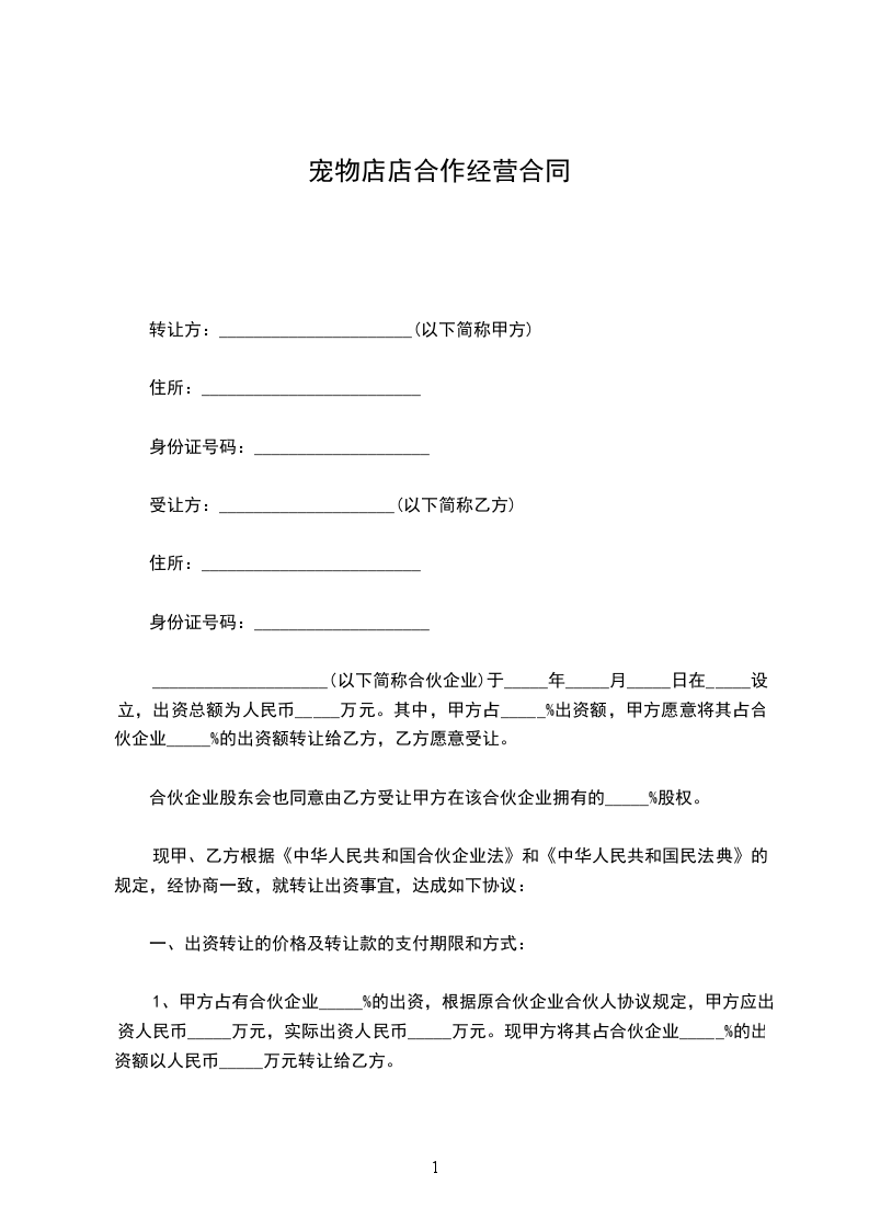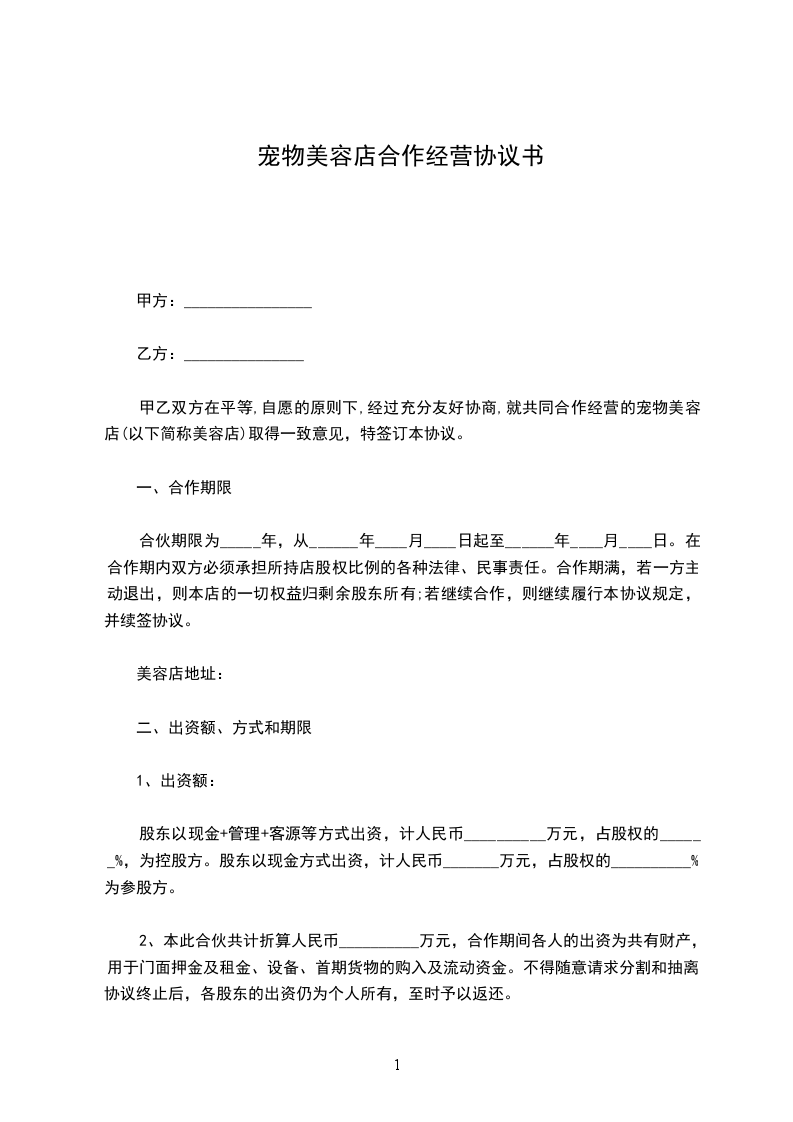 甲乙双方在平等,自愿的原则下,经过充分友好协商,就共同合作经营的宠物美容店(以下简称美容店)取得一致意见,特签订本协议。