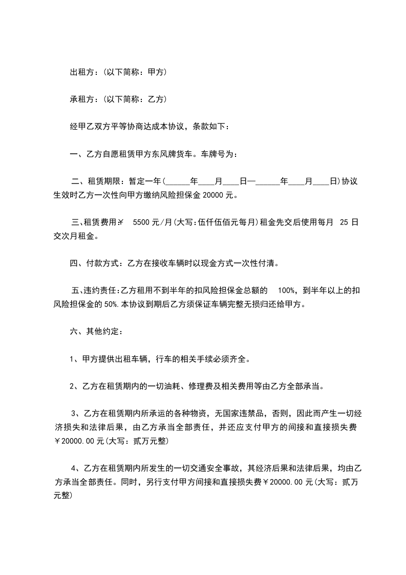 五、违约责任:乙方租用不到半年的扣风险担保金总额的100%,到半年以上的扣风险担保金的50%.本协议到期后乙方须保证车辆完整无损归还给甲方。