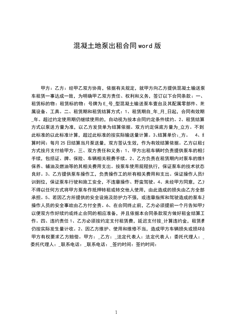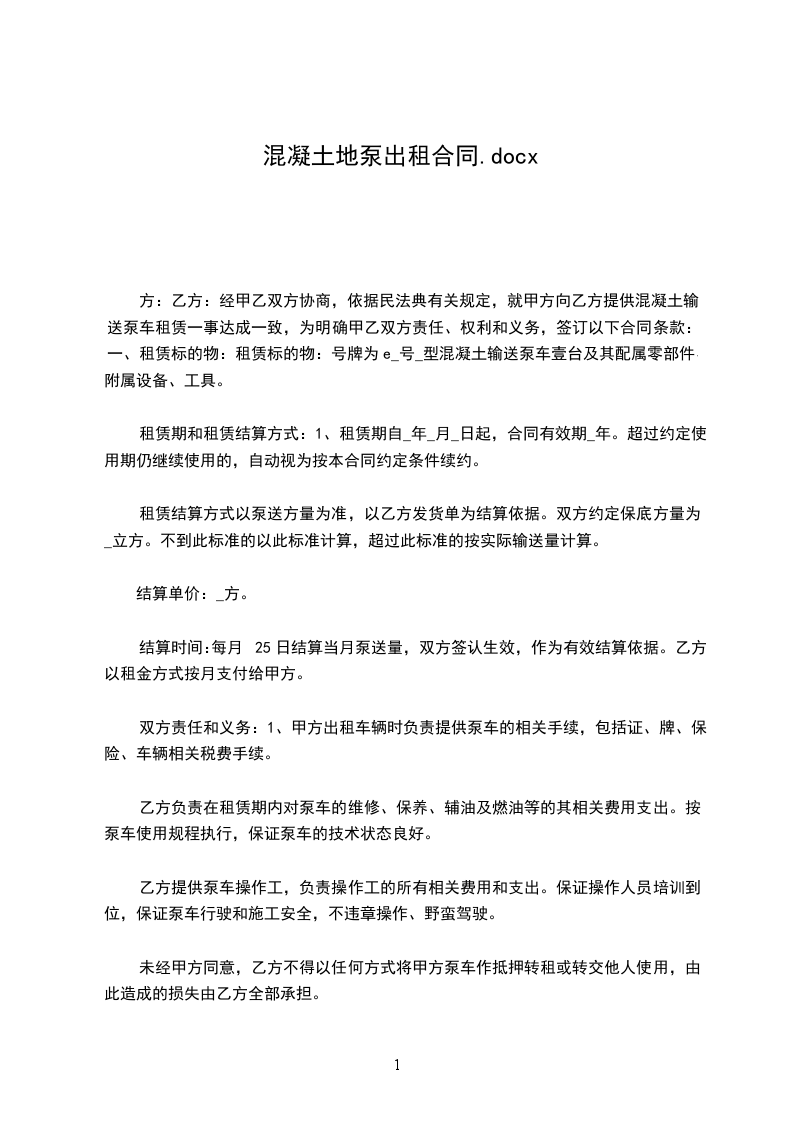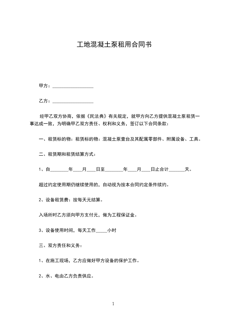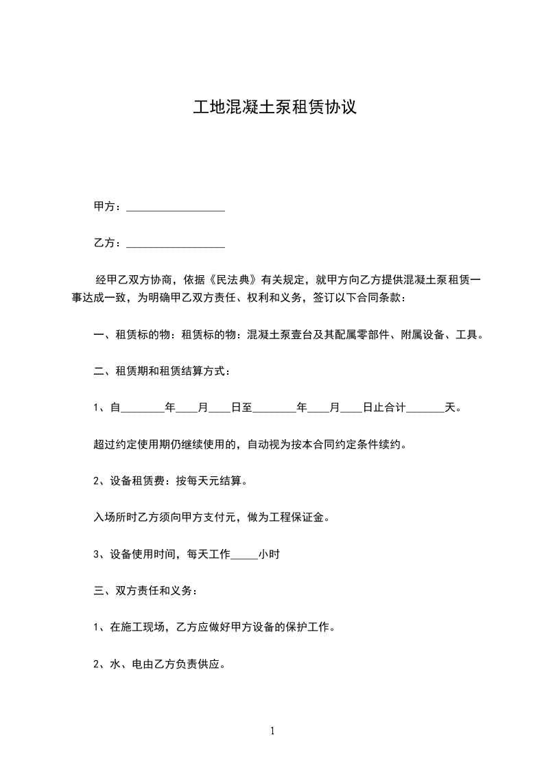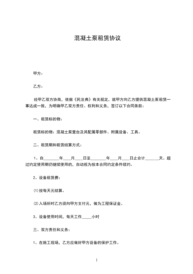 经甲乙双方协商,依据《民法典》有关规定,就甲方向乙方提供混凝土泵租赁一事达成一致,为明确甲乙双方责任、权利和义务,签订以下合同条款: