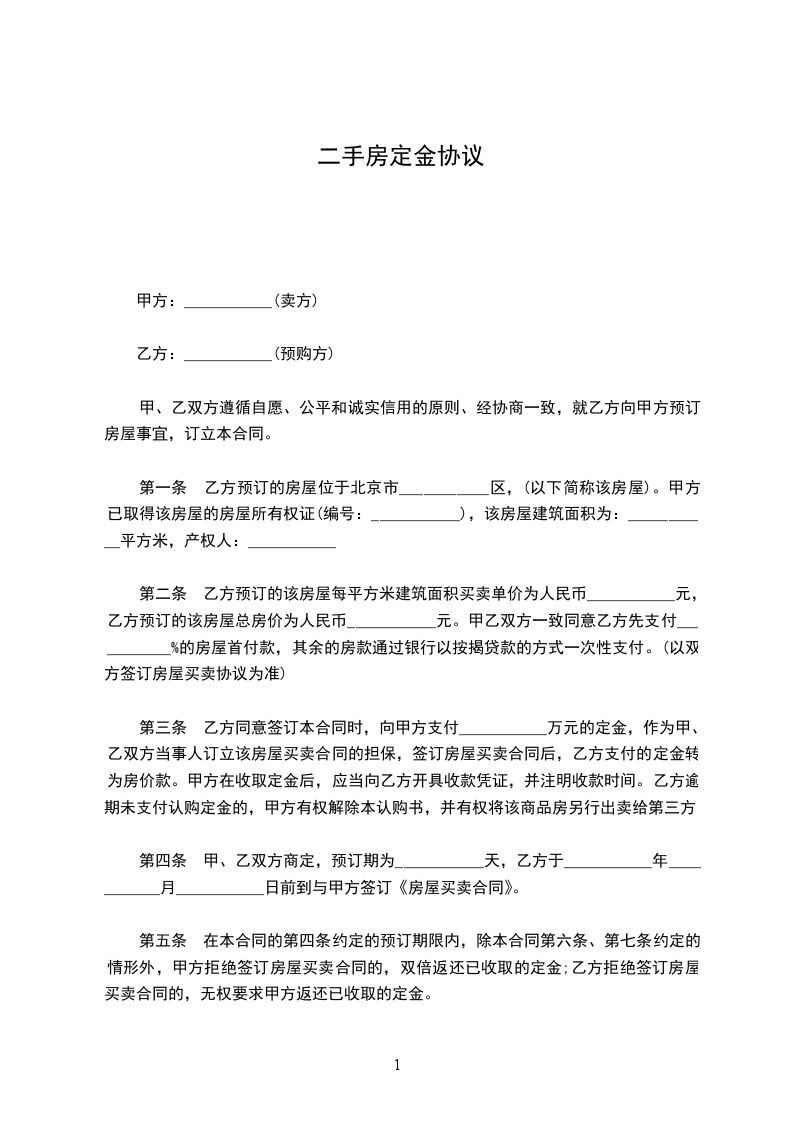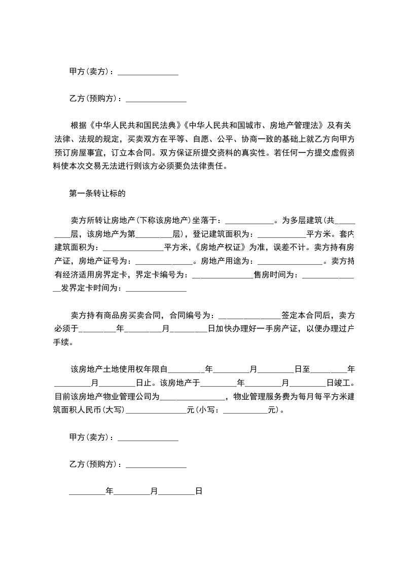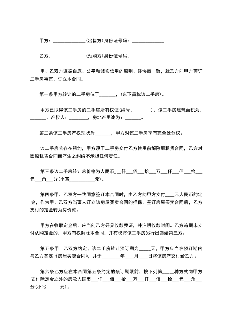 第四条:甲、乙双方商定,预订期为 天,乙方于20xx年 月 日前到 与甲方签订《房屋买卖合同》。