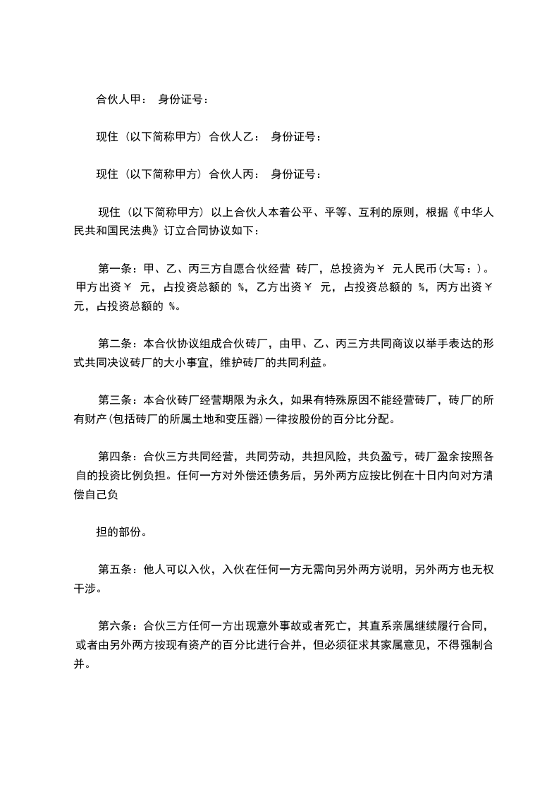 第一条:甲、乙、丙三方自愿合伙经营 砖厂,总投资为¥ 元人民币(大写:)。甲方出资¥ 元,占投资总额的 %,乙方出资¥ 元,占投资总额的 %,丙方出资¥ 元,占投资总额的 %。
