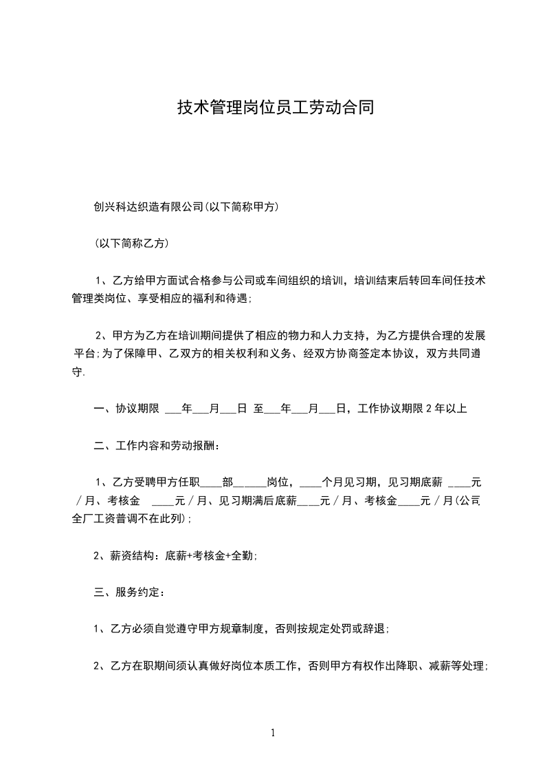 1、乙方给甲方面试合格参与公司或车间组织的培训,培训结束后转回车间任技术管理类岗位、享受相应的福利和待遇;