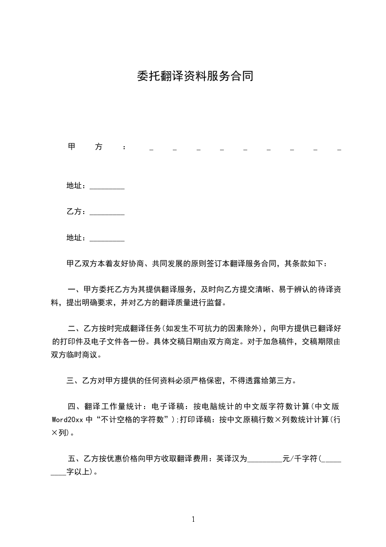 五、乙方按优惠价格向甲方收取翻译费用:英译汉为_________元/千字符(_________字以上)。