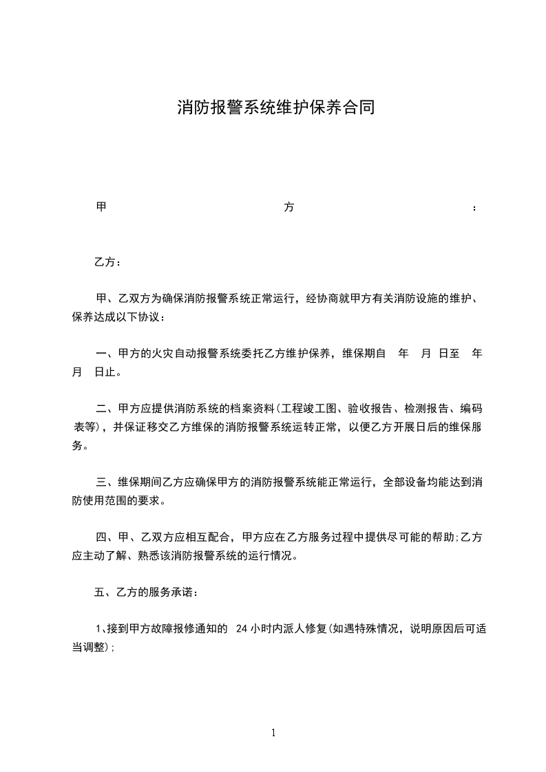 一、甲方的火灾自动报警系统委托乙方维护保养,维保期自 年 月 日至 年 月 日止。