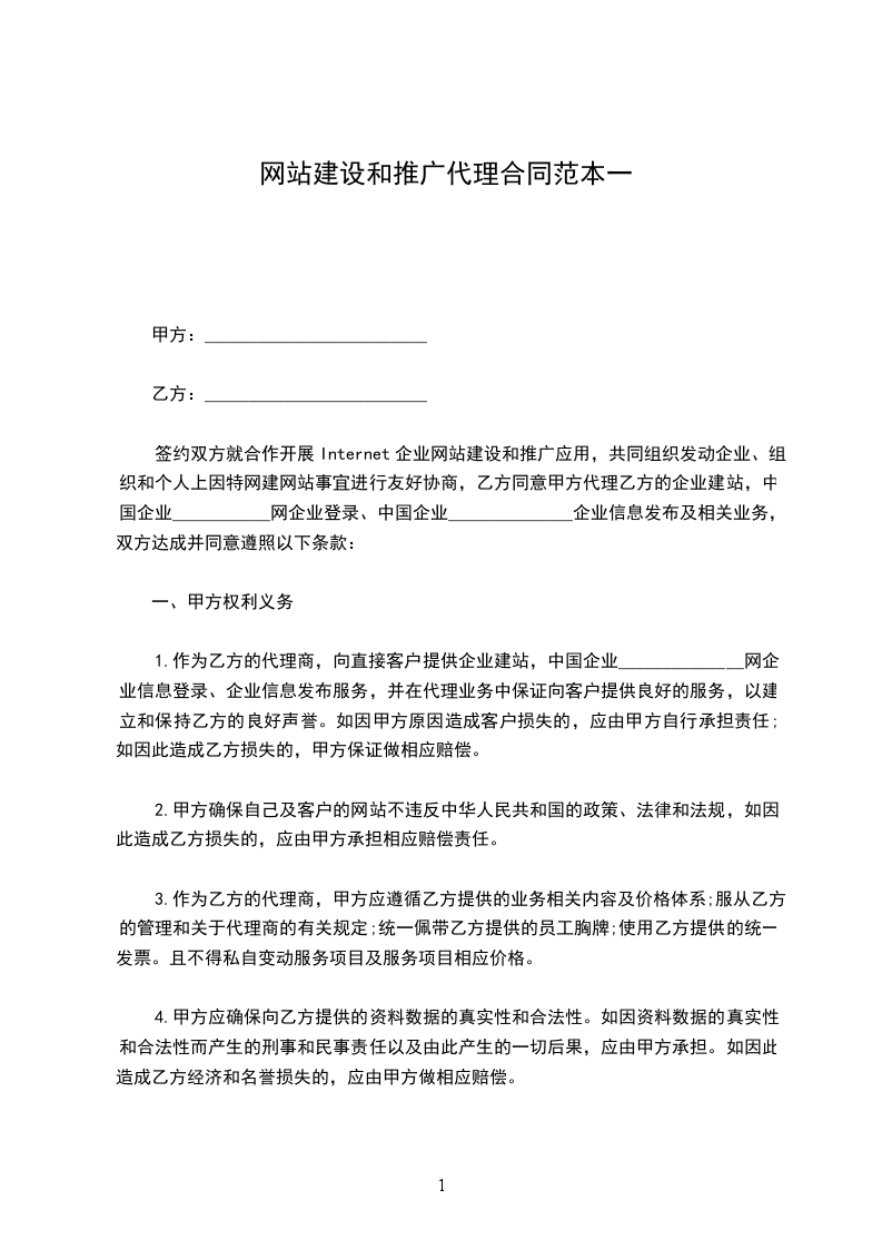 签约双方就合作开展Internet企业网站建设和推广应用,共同组织发动企业、组织和个人上因特网建网站事宜进行友好协商,乙方同意甲方代理乙方的企业建站,中国企业___________网企业登录、中国企业______________企业信息发布及相关业务,双方达成并同意遵照以下条款: