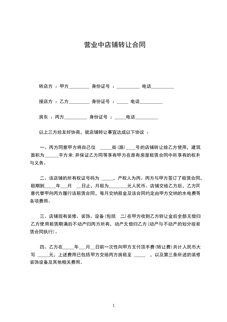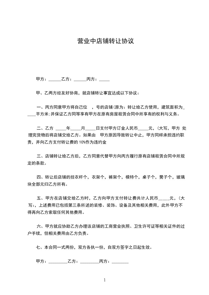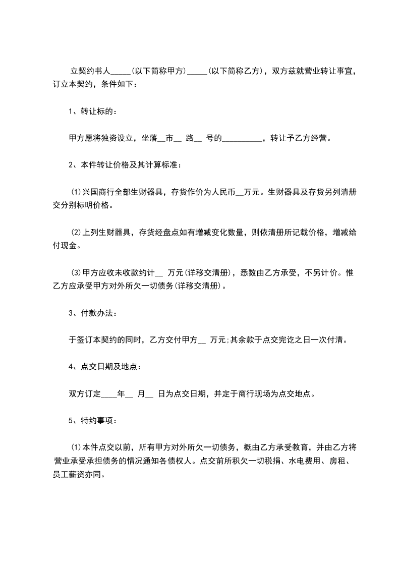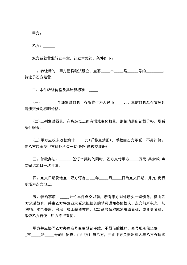 甲方愿将独资设立,坐落_______市_______路_______号的兴国商行,转让予乙方经营。
