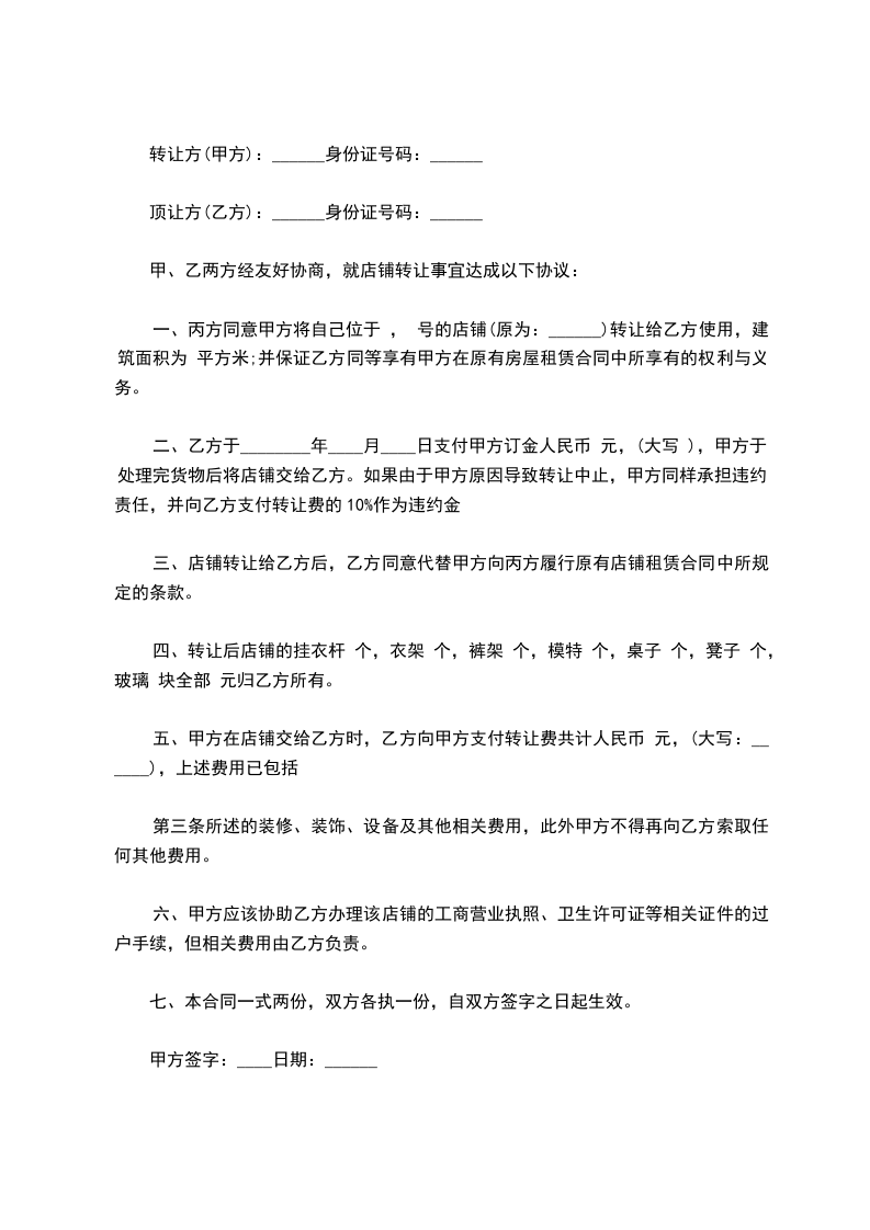 (3)商号现承租坐落_________________市_________________路_________________号的租赁权,由甲方让与乙方,并由甲方负责出租人与乙方办理续 年,与乙方另行换立租约,如出租人不允许续租或要求增加租金或提出其他条件,致乙方受害时,甲方应负赔偿责任。