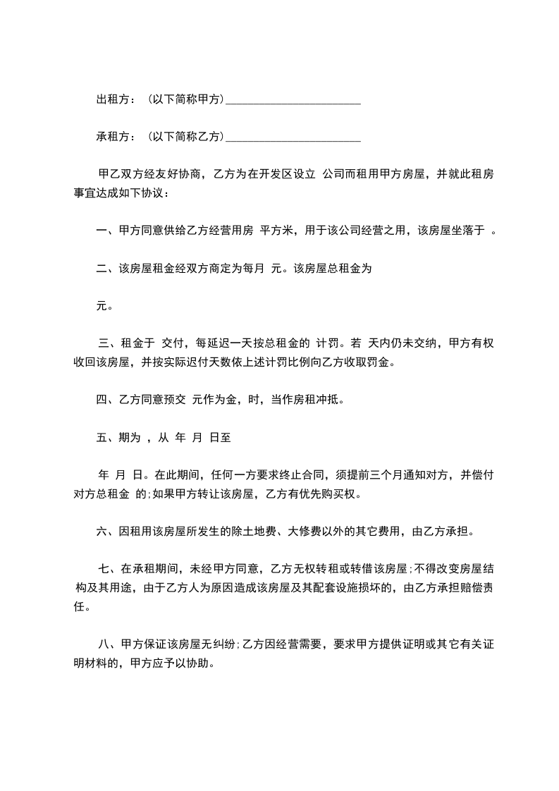甲乙双方经友好协商,乙方为在开发区设立 公司而租用甲方房屋,并就此租房事宜达成如下协议:
