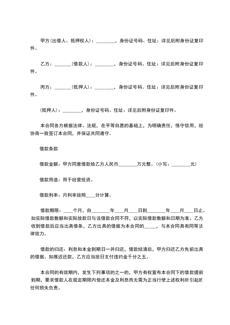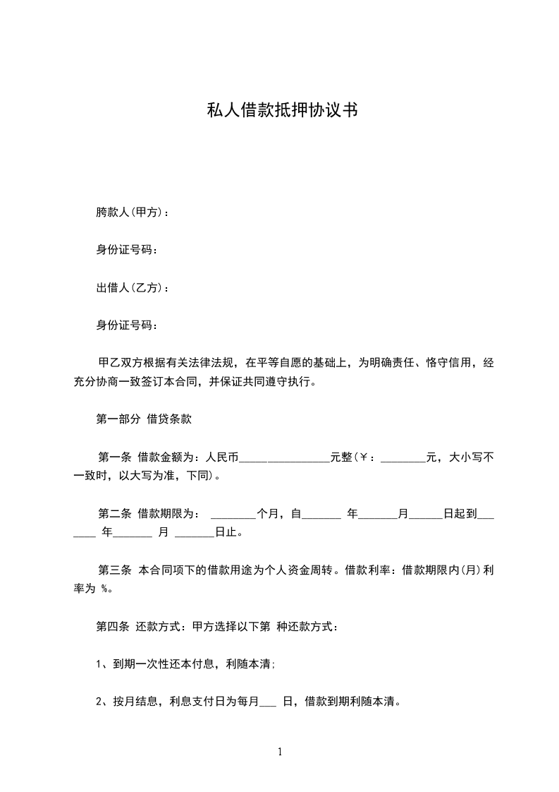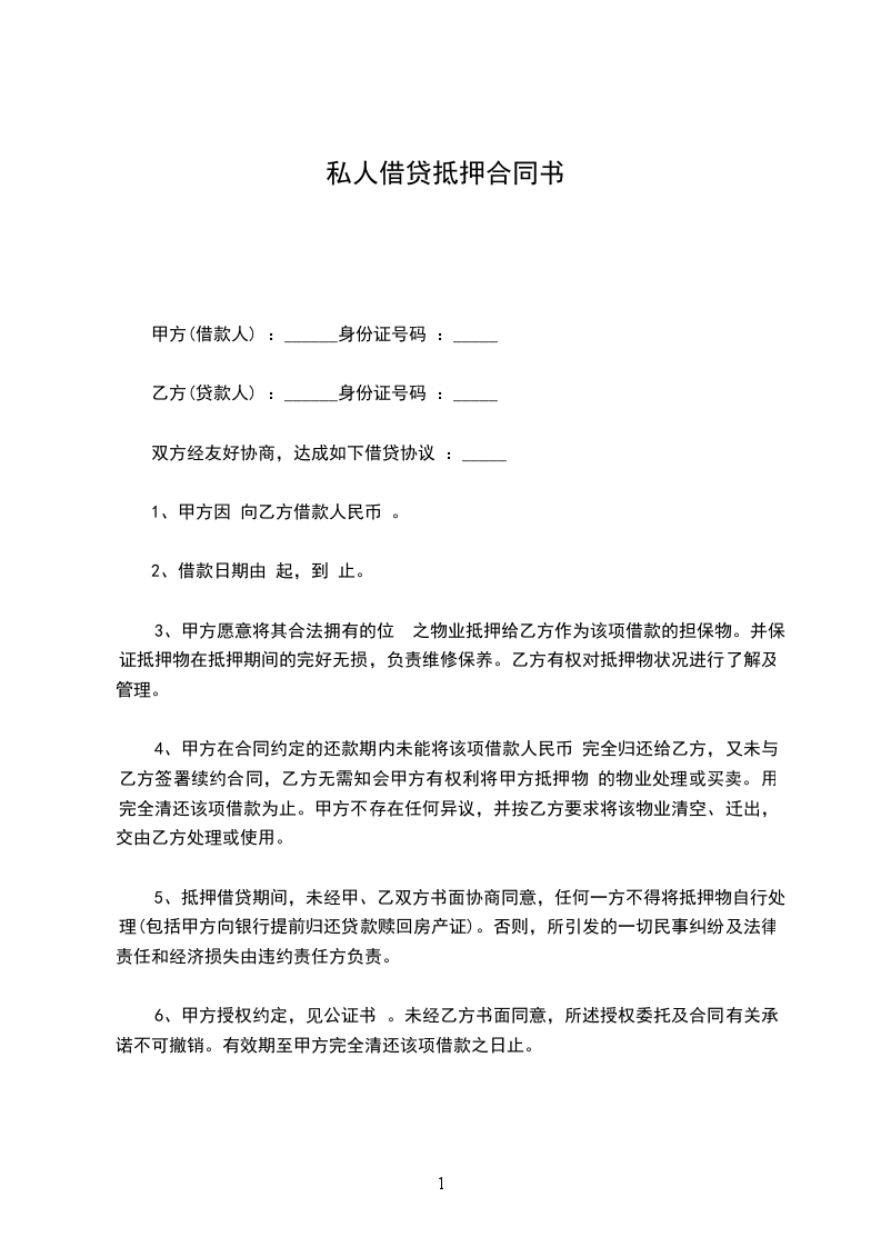 抵押人(甲方):__________ 身份证号码:__________