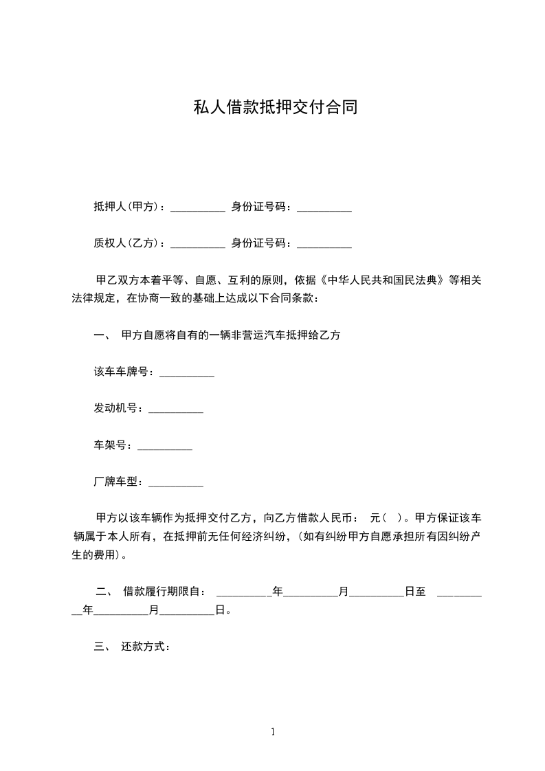 一、 甲方自愿将自有的一辆非营运汽车抵押给乙方