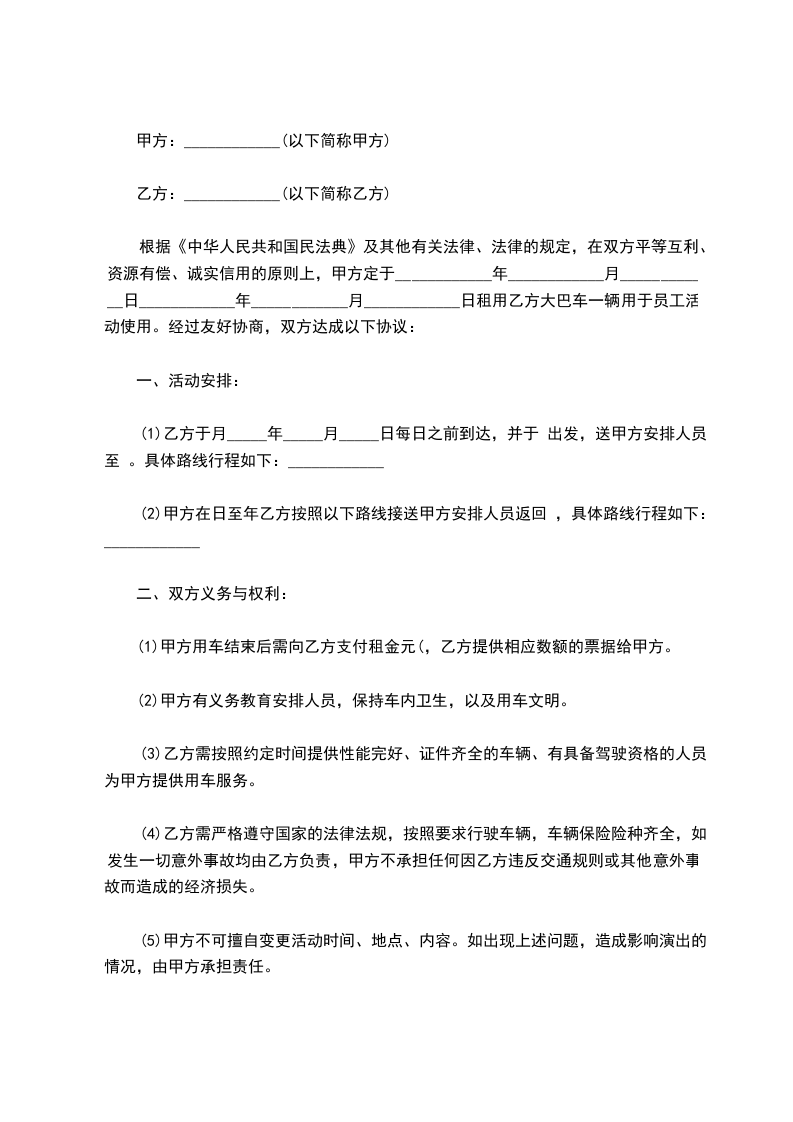 根据《中华人民共和国民法典》及其他有关法律、法律的规定,在双方平等互利、资源有偿、诚实信用的原则上,甲方定于____________年____________月____________日____________年____________月____________日租用乙方大巴车一辆用于员工活动使用。经过友好协商,双方达成以下协议: