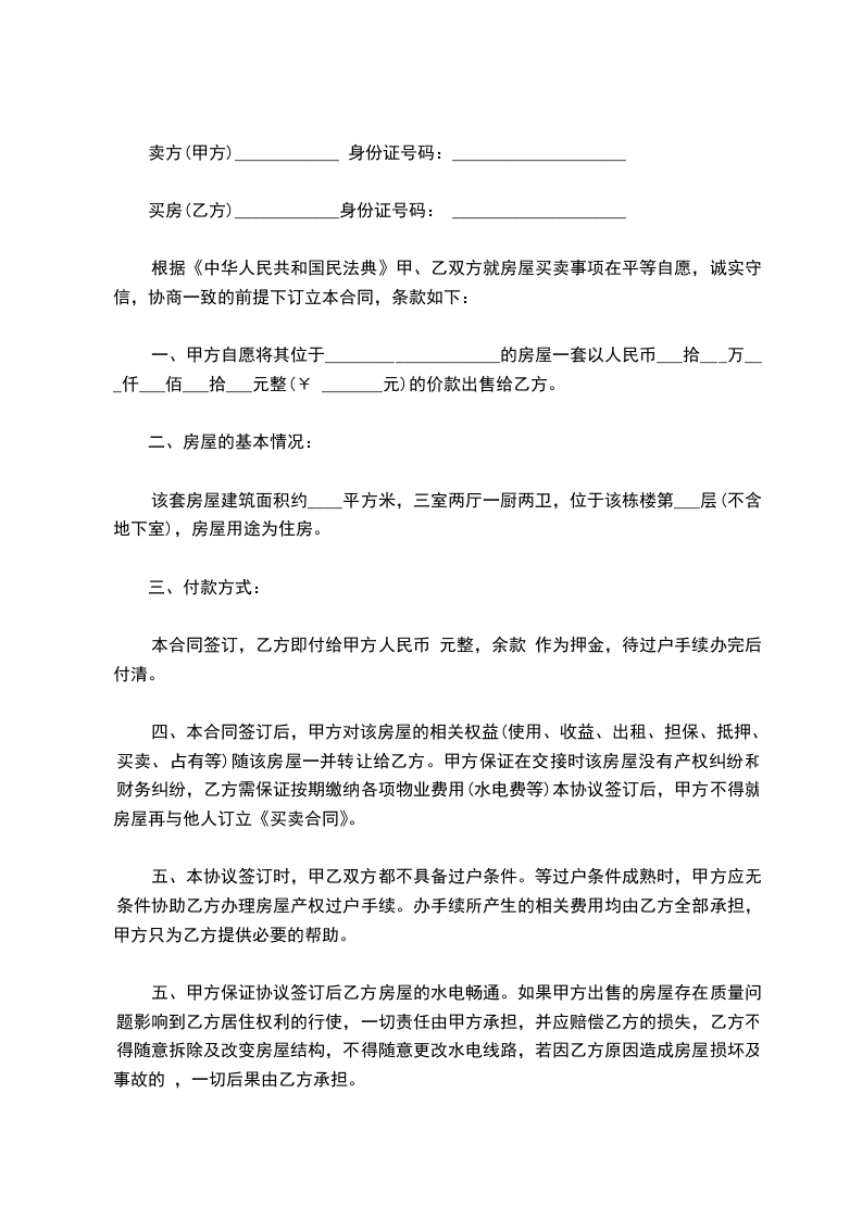 根据《中华人民共和国民法典》甲、乙双方就房屋买卖事项在平等自愿,诚实守信,协商一致的前提下订立本合同,条款如下: