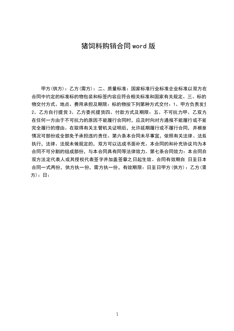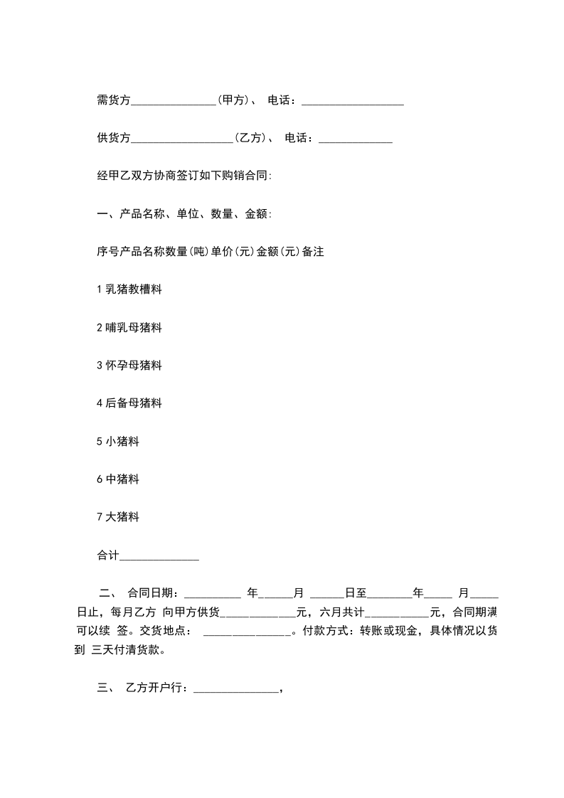 二、 合同日期:__________ 年______月 ______日至________年_____ 月_____ 日止,每月乙方 向甲方供货_____________元,六月共计___________元,合同期满可以续 签。交货地点: _______________。付款方式:转账或现金,具体情况以货到 三天付清货款。