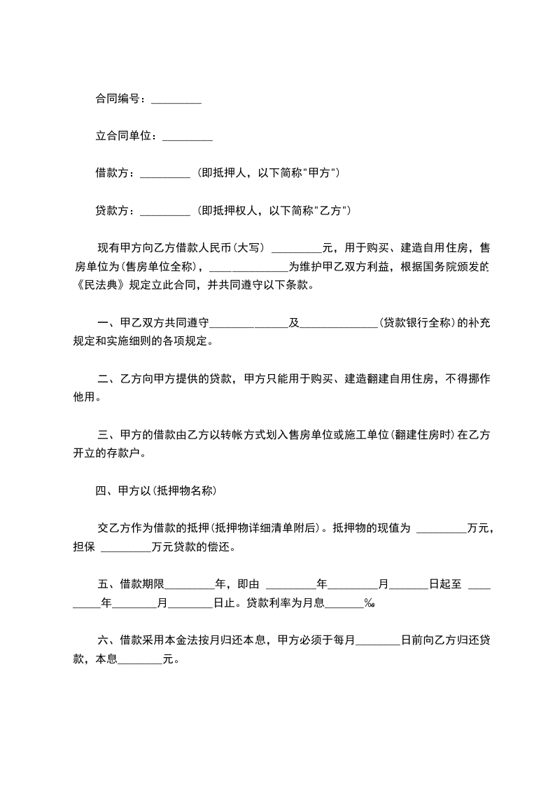 现有甲方向乙方借款人民币(大写) _________元,用于购买、建造自用住房,售房单位为(售房单位全称),______________为维护甲乙双方利益,根据国务院颁发的《民法典》规定立此合同,并共同遵守以下条款。