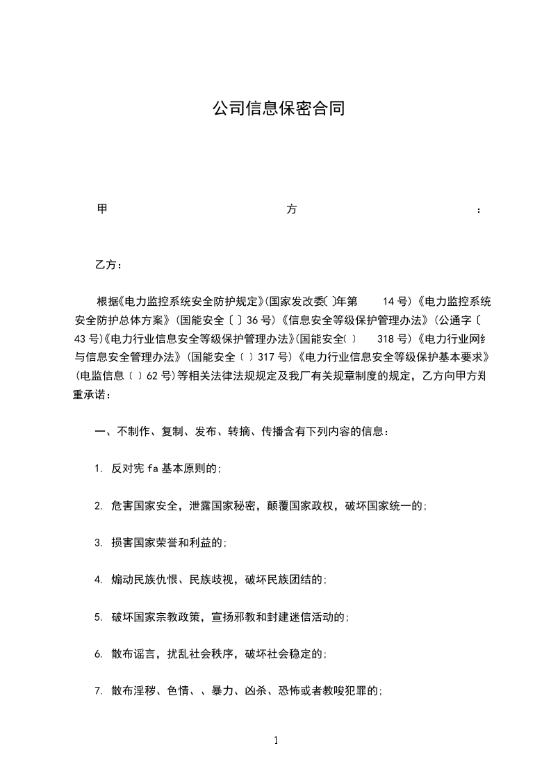 根据《电力监控系统安全防护规定》(国家发改委〔〕年第14号)《电力监控系统安全防护总体方案》(国能安全〔〕36号)《信息安全等级保护管理办法》(公通字〔〕43号)《电力行业信息安全等级保护管理办法》(国能安全﹝﹞318号)《电力行业网络与信息安全管理办法》(国能安全﹝﹞317号)《电力行业信息安全等级保护基本要求》(电监信息﹝﹞62号)等相关法律法规规定及我厂有关规章制度的规定,乙方向甲方郑重承诺: