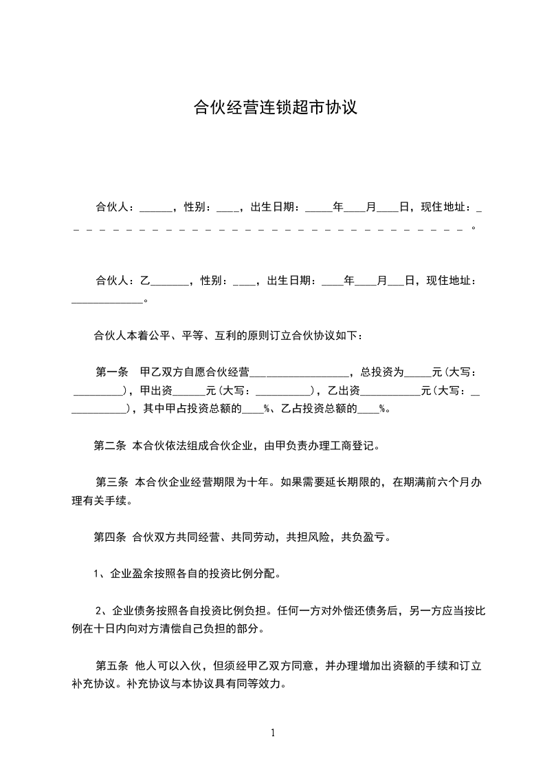 第一条 甲乙双方自愿合伙经营__________________,总投资为_____元(大写:_________),甲出资______元(大写:__________),乙出资___________元(大写:____________),其中甲占投资总额的____%、乙占投资总额的____%。