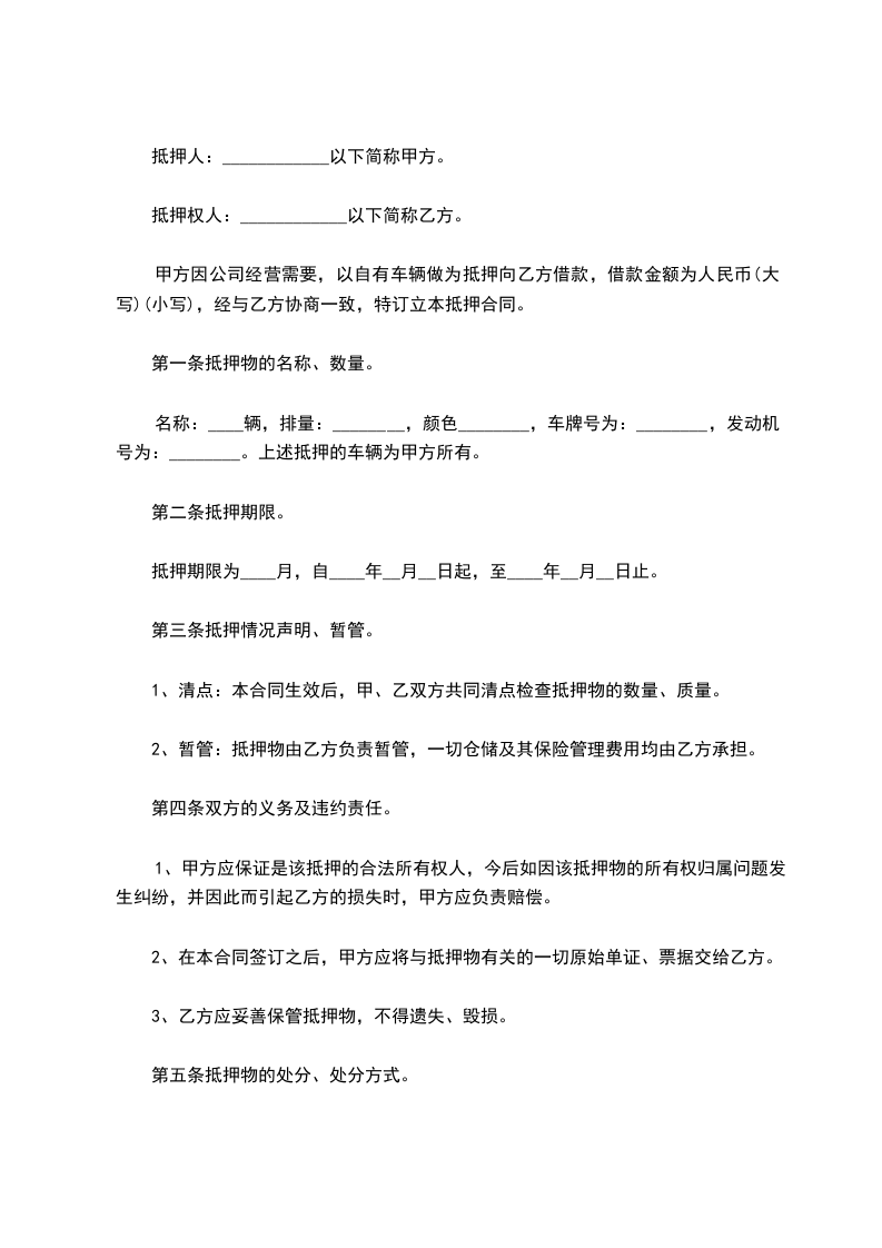 甲方因公司经营需要,以自有车辆做为抵押向乙方借款,借款金额为人民币(大写)(小写),经与乙方协商一致,特订立本抵押合同。