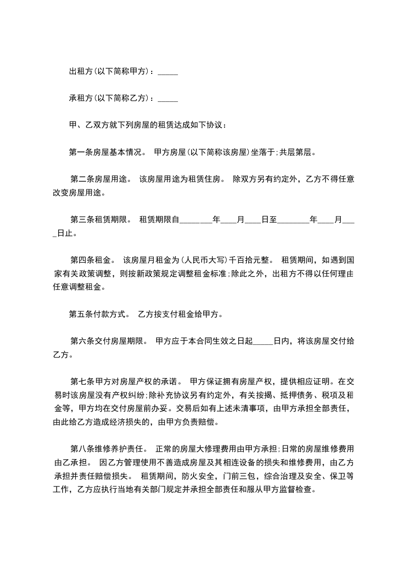 第一条房屋基本情况。 甲方房屋(以下简称该房屋)坐落于;共层第层。