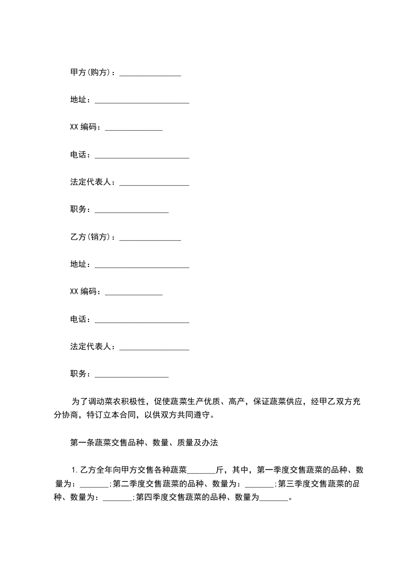 一、甲乙双方充分沟通基础上,甲方的果蔬常年供应乙方,经甲乙双方协商签订以下条款: