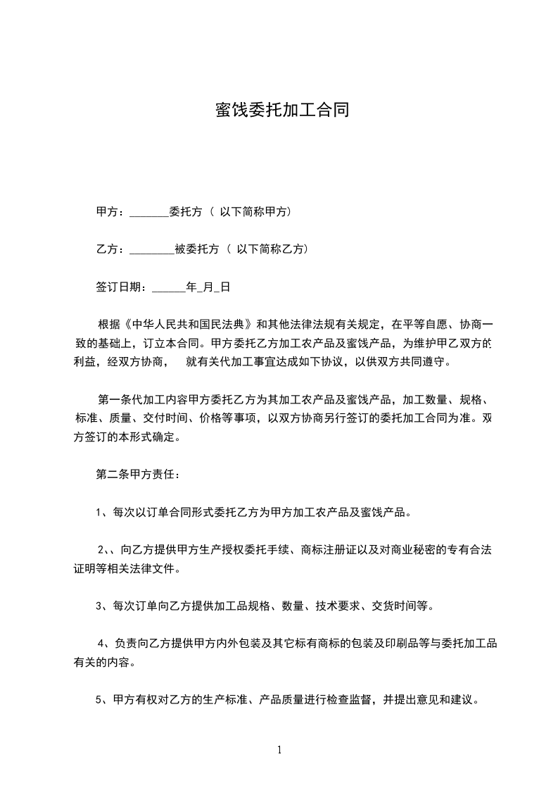 根据《中华人民共和国民法典》和其他法律法规有关规定,在平等自愿、协商一致的基础上,订立本合同。甲方委托乙方加工农产品及蜜饯产品,为维护甲乙双方的利益,经双方协商, 就有关代加工事宜达成如下协议,以供双方共同遵守。