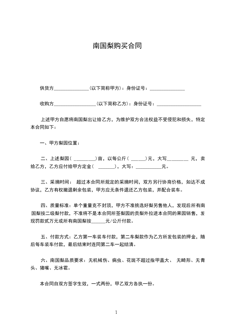 四、质量标准:单个重量克不封顶,甲方不准挑选好梨另售他人,发现后所有南国梨按二级梨付款,不准将不是本合同所签梨园的贡梨外拉进本合同的果园销售,发现罚款贰万元或所有南国梨按______元/公斤付款。