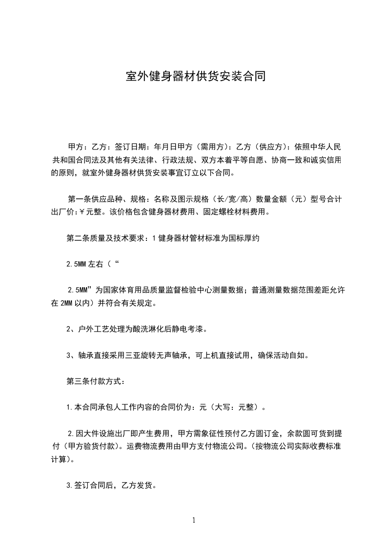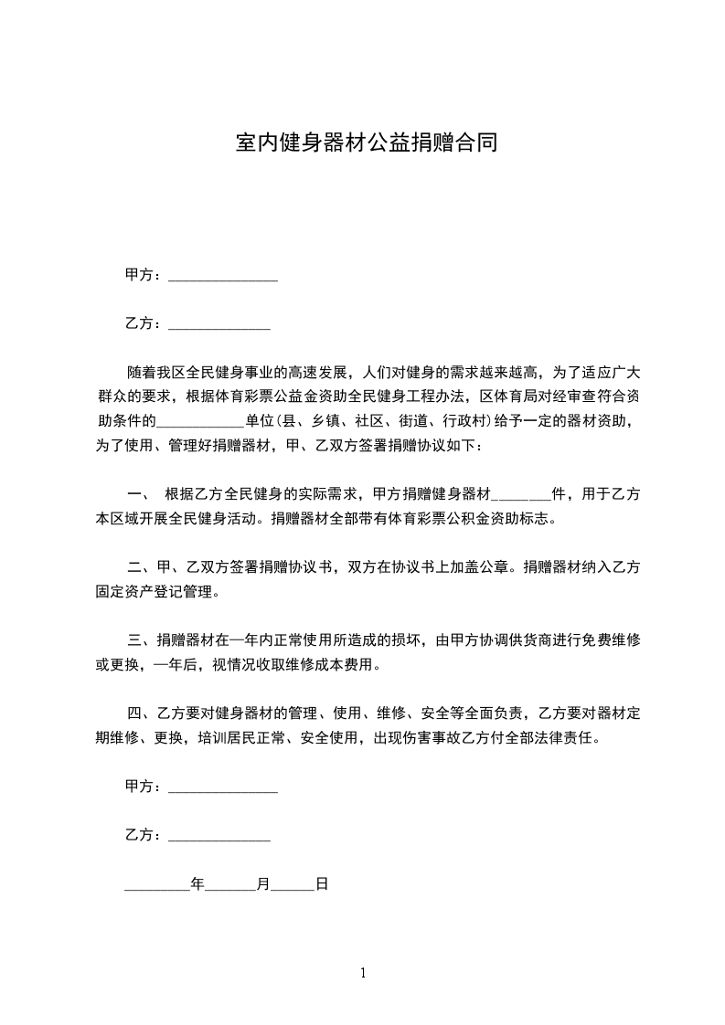 一、 根据乙方全民健身的实际需求,甲方捐赠健身器材________件,用于乙方本区域开展全民健身活动。捐赠器材全部带有体育彩票公积金资助标志。
