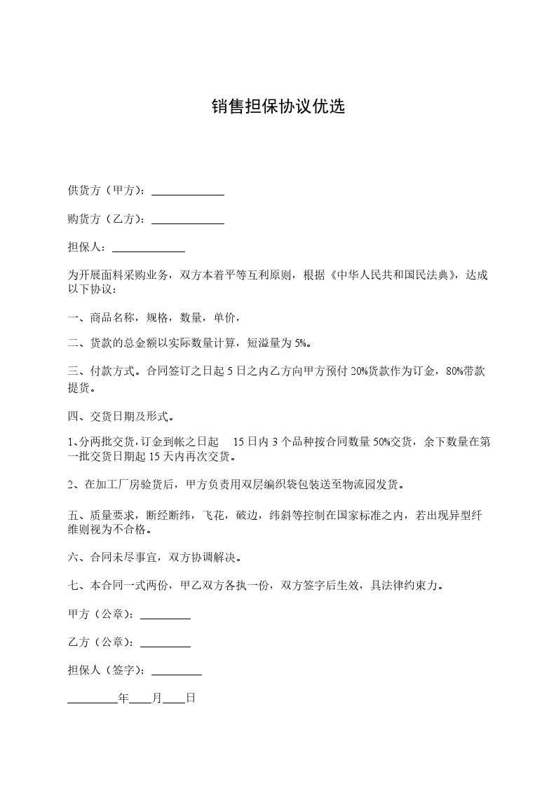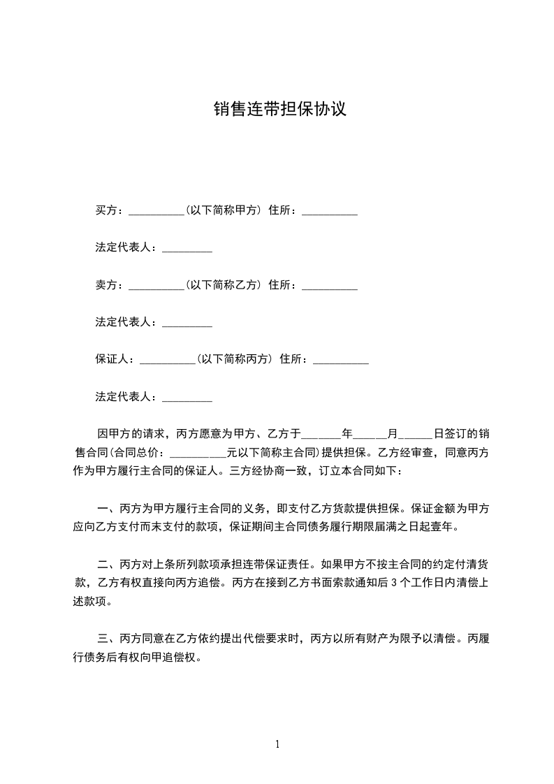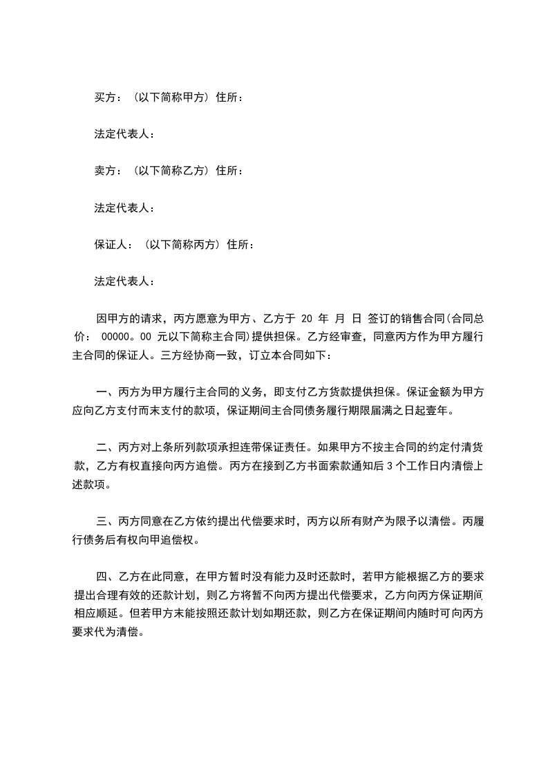 因甲方的请求,丙方愿意为甲方、乙方于 20 年 月 日 签订的销售合同(合同总价: 00000。00 元以下简称主合同)提供担保。乙方经审查,同意丙方作为甲方履行主合同的保证人。三方经协商一致,订立本合同如下: