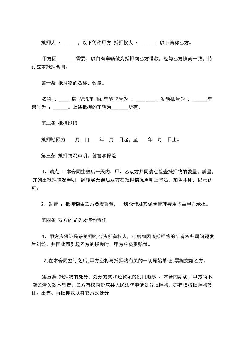 名称:____辆,排量:________,颜色________,车牌号为:________,发动机号为:________。上述抵押的车辆为甲方所有。