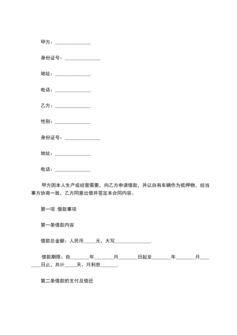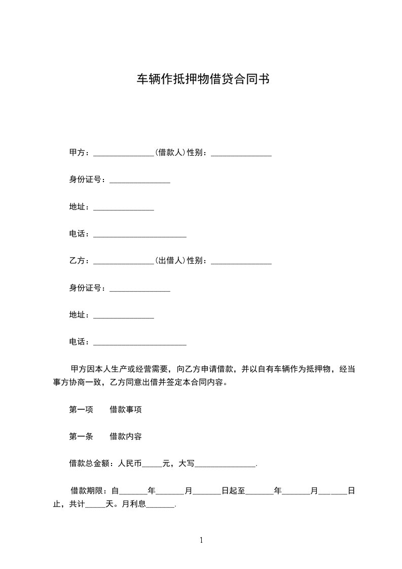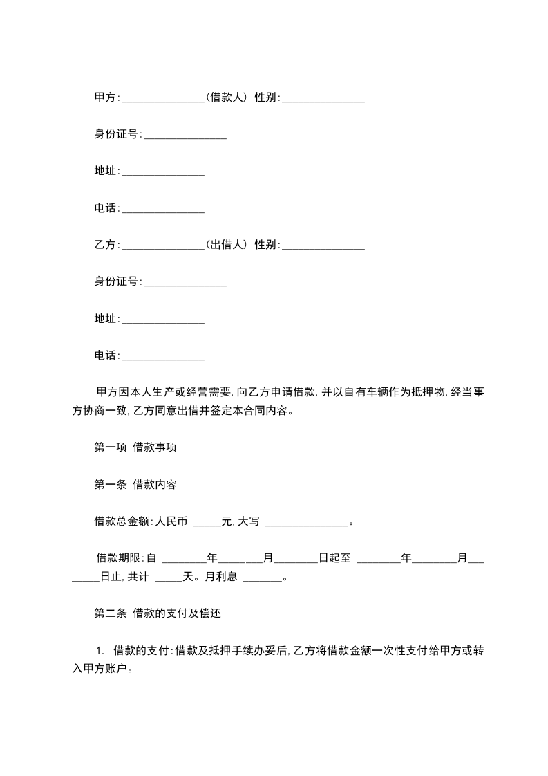 甲方因公司经营需要,以自有车辆做为抵押向乙方借款,借款金额为人民币(大写)(小写),经与乙方协商一致,特订立本抵押合同。