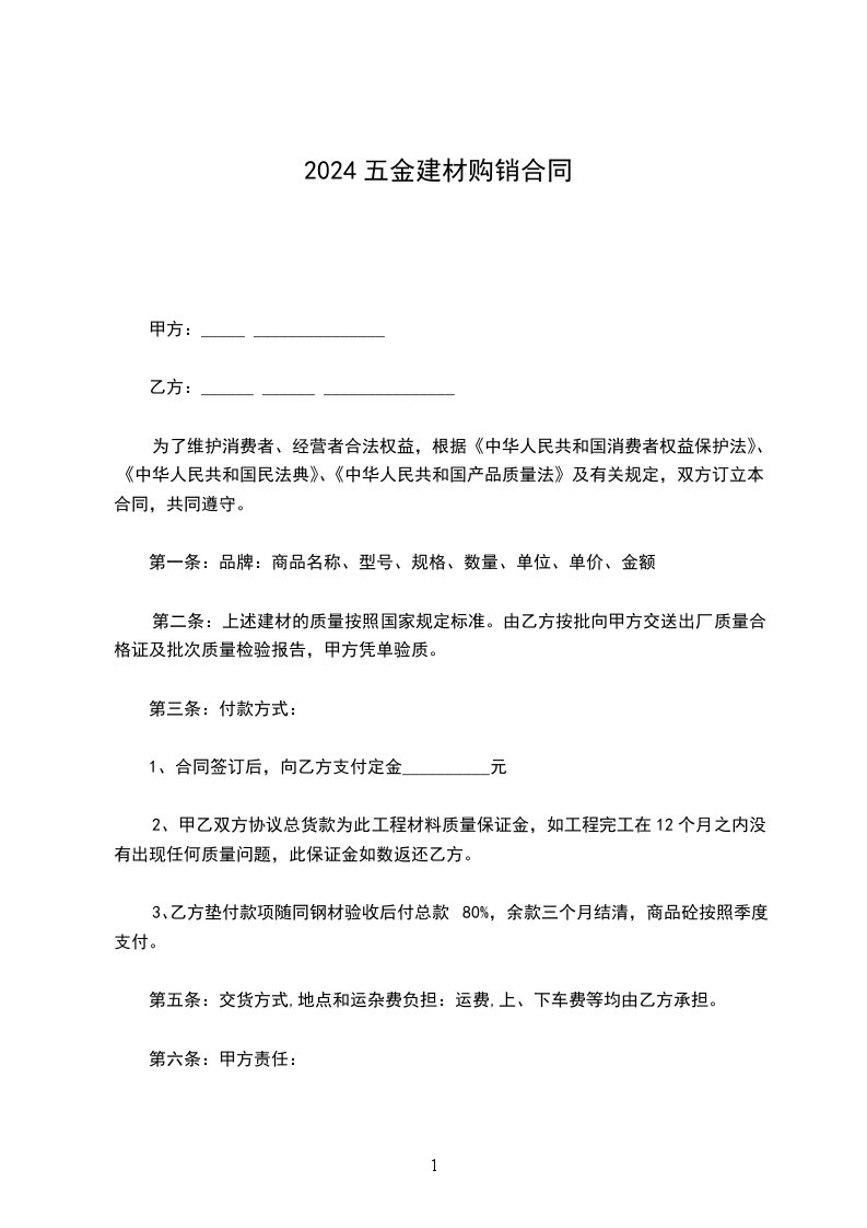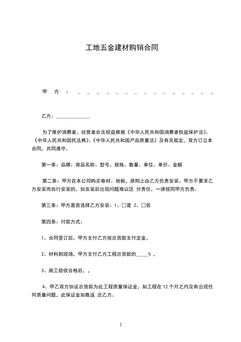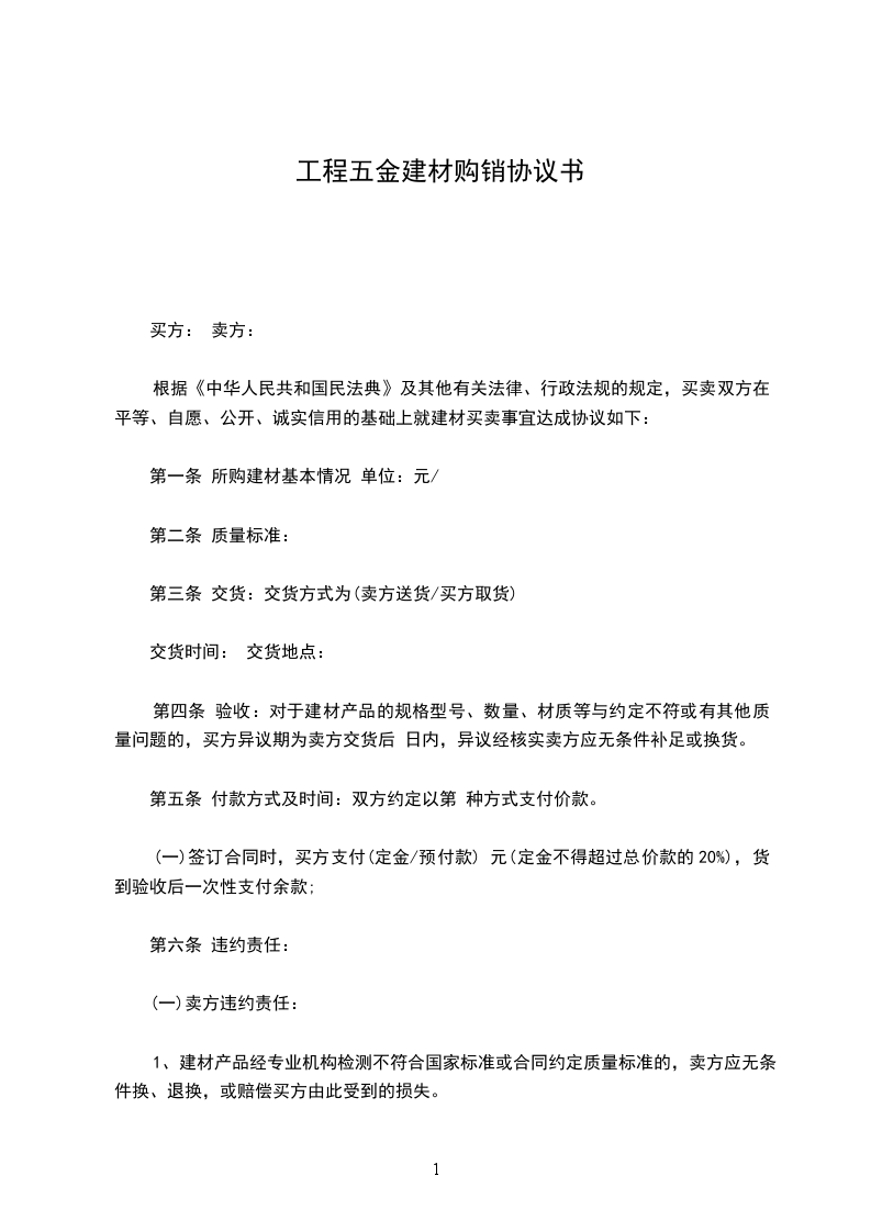 根据《中华人民共和国民法典》及其他有关法律、行政法规的规定,买卖双方在平等、自愿、公开、诚实信用的基础上就建材买卖事宜达成协议如下: