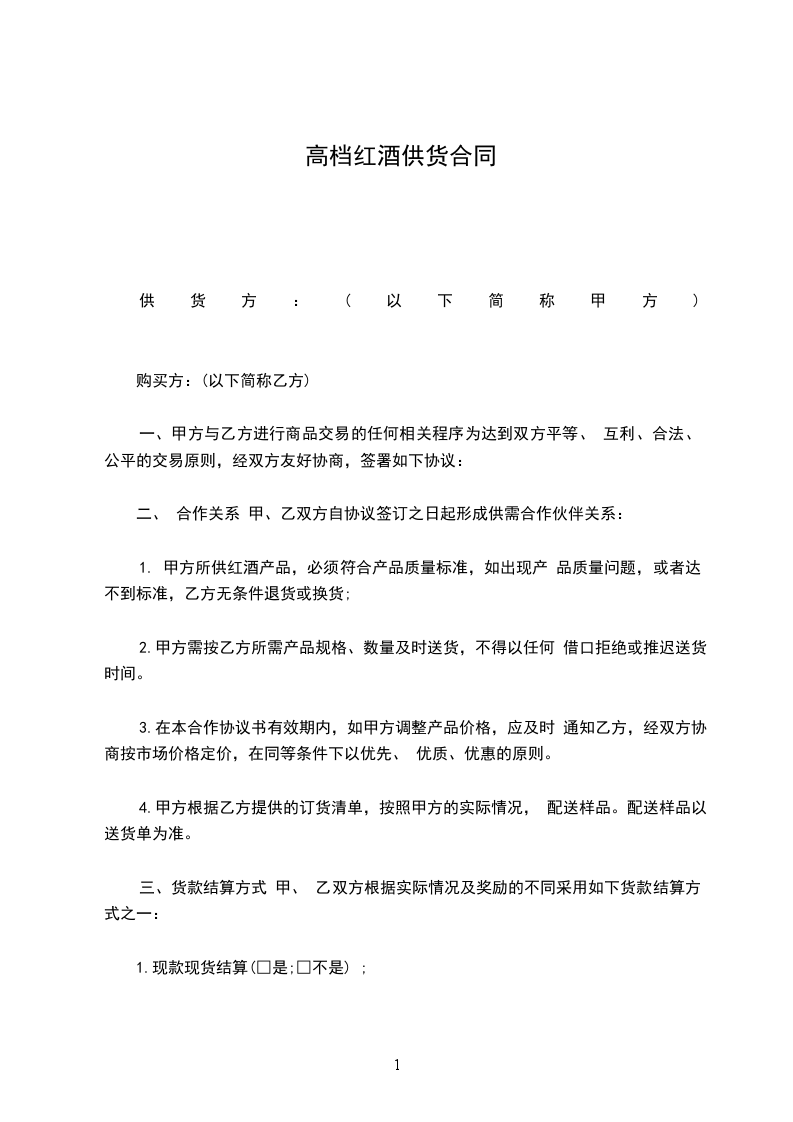 1. 甲方所供红酒产品,必须符合产品质量标准,如出现产 品质量问题,或者达不到标准,乙方无条件退货或换货;