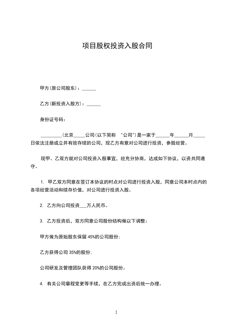 1. 甲乙双方同意在签订本协议的时点对公司进行投资入股,同意公司本时点内的各项经营活动和续存价值,对公司进行投资入股。