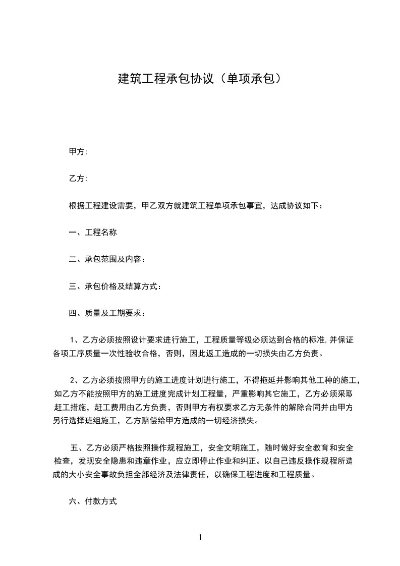 根据工程建设需要,甲乙双方就建筑工程单项承包事宜,达成协议如下: