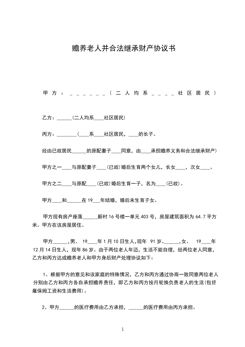 经由已故居民______的原配妻子____同意,由____承担赡养义务和合法继承财产)