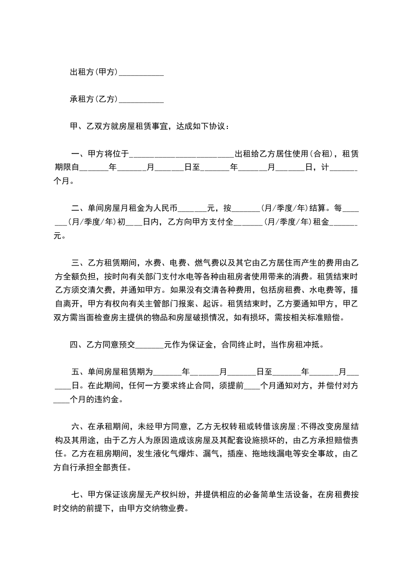 五、单间房屋租赁期为_______年_______月_______日至_______年_______月_______日。在此期间,任何一方要求终止合同,须提前____个月通知对方,并偿付对方____个月的违约金。