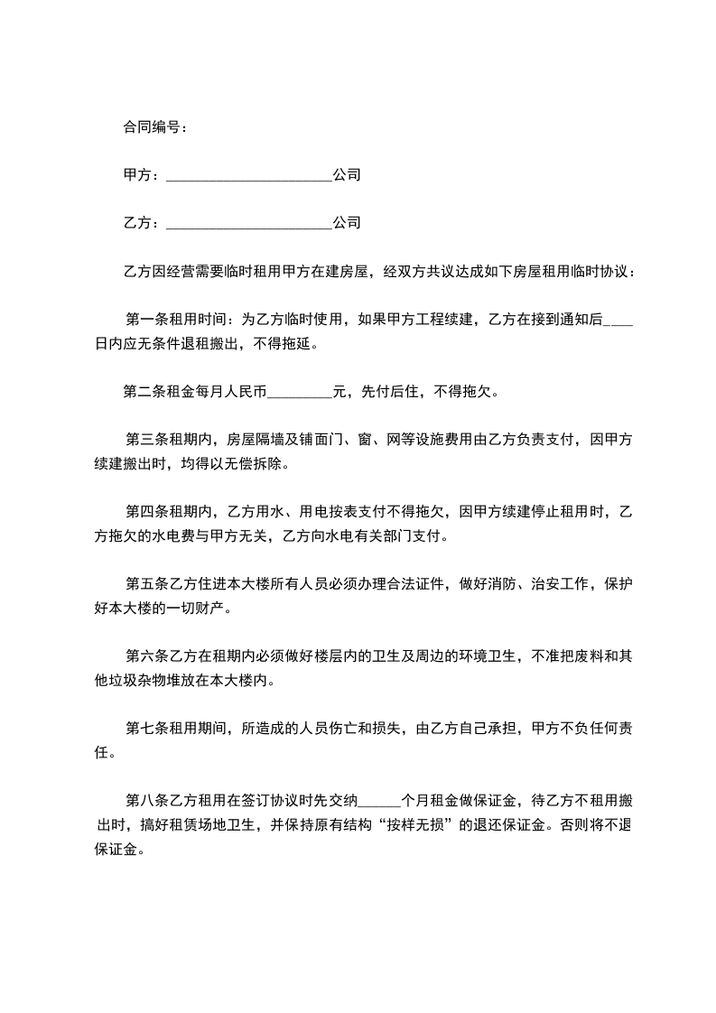 乙方因经营需要临时租用甲方在建房屋,经双方共议达成如下房屋租用临时协议: