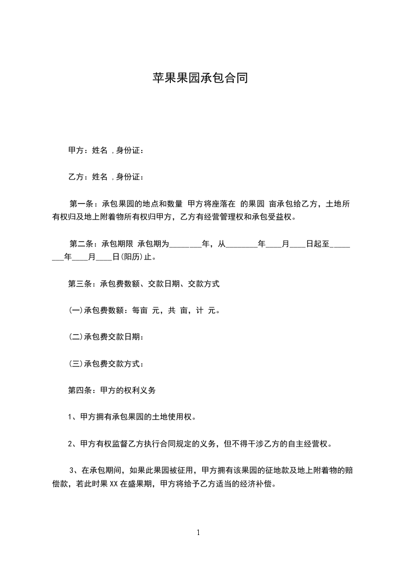第一条:承包果园的地点和数量 甲方将座落在 的果园 亩承包给乙方,土地所有权归及地上附着物所有权归甲方,乙方有经营管理权和承包受益权。