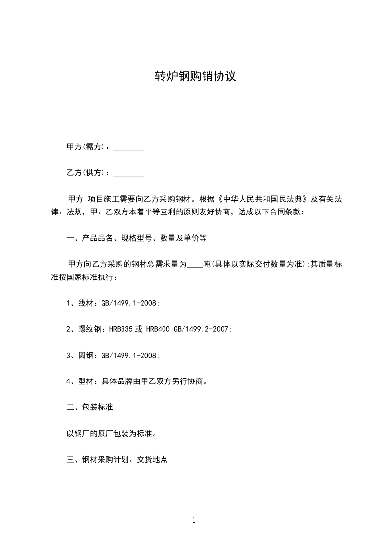 甲方 项目施工需要向乙方采购钢材。根据《中华人民共和国民法典》及有关法律、法规,甲、乙双方本着平等互利的原则友好协商,达成以下合同条款: