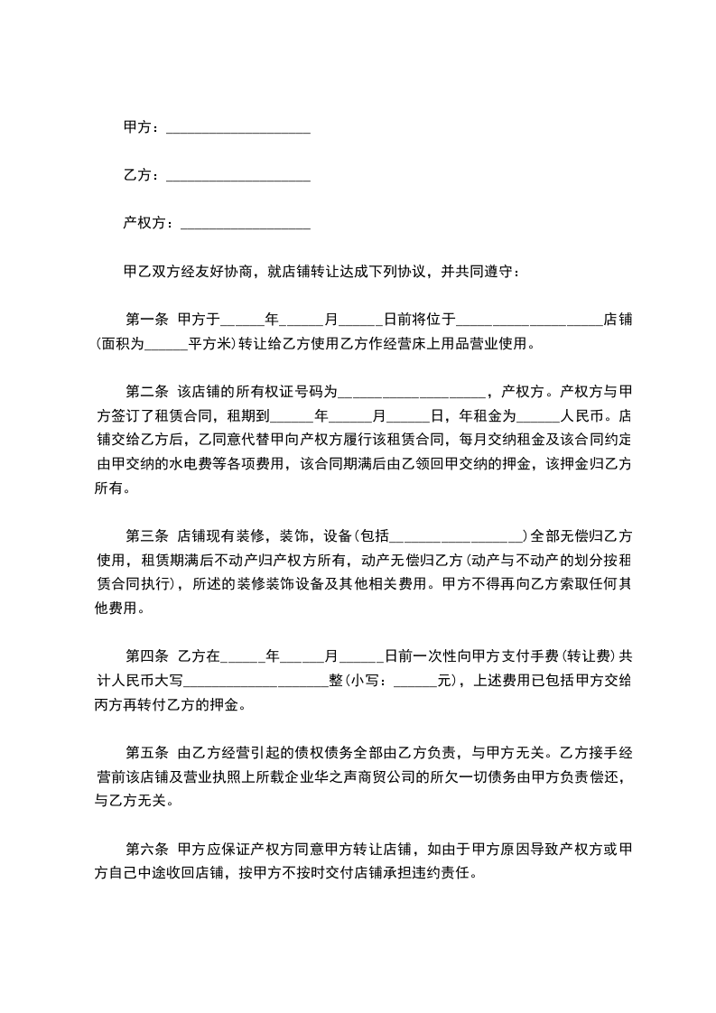第六条 甲方应保证产权方同意甲方转让店铺,如由于甲方原因导致产权方或甲方自己中途收回店铺,按甲方不按时交付店铺承担违约责任。