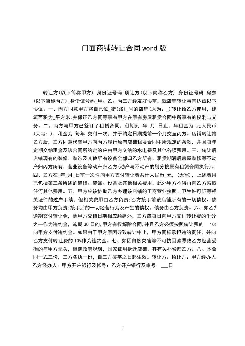 第八条 如果合同签订期三年内政府已下令拆迁店铺,甲方需退偿全部转让费,赔还装修损失______元,并支付转让费的______的违约金。如果合同签订之后政府明令拆迁店铺,或者市政建设(如修,扩路,建天桥,立交桥,修地铁等)导致乙方难以经营,乙方有权解除合同,甲方退还剩余租期的转让费,押金仍归乙方(前述顺延除外)。