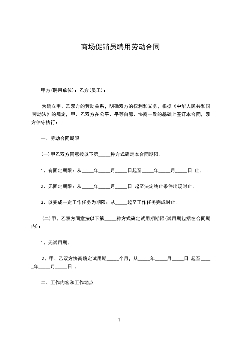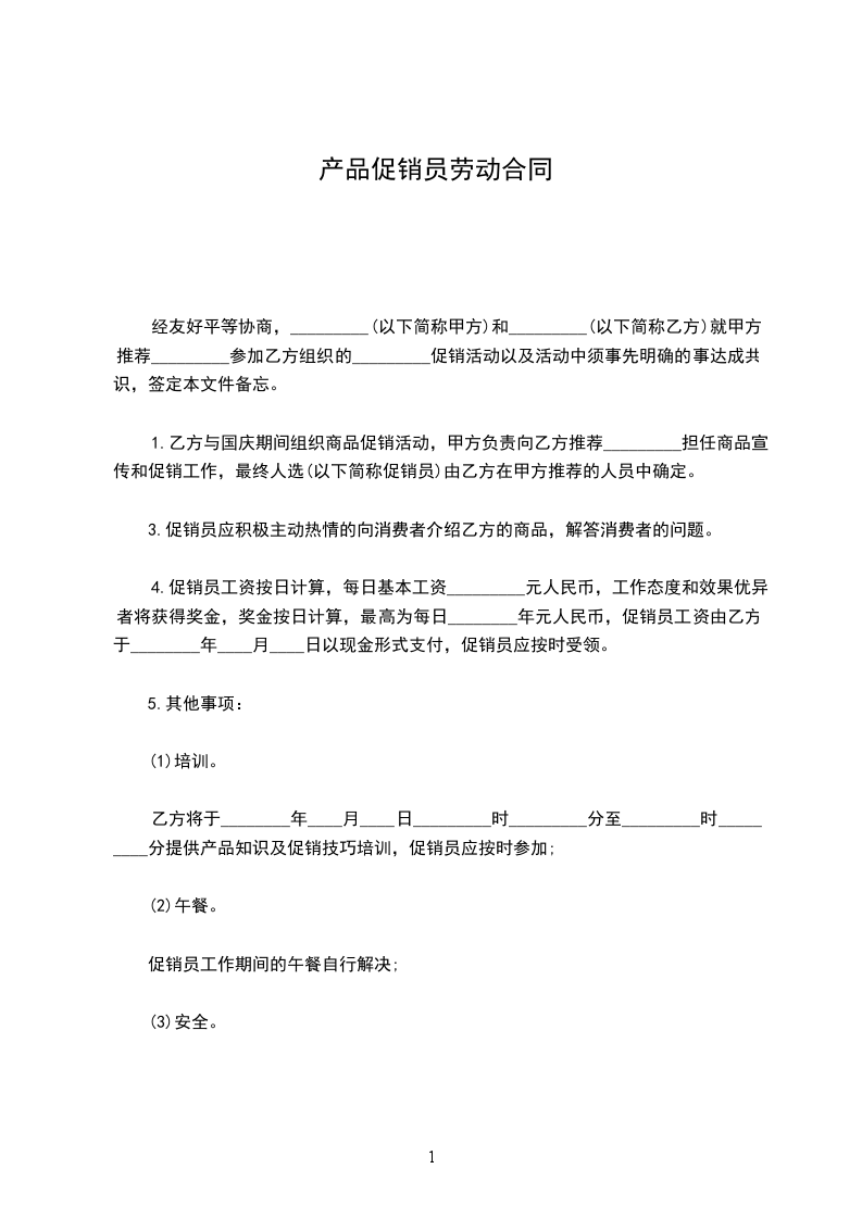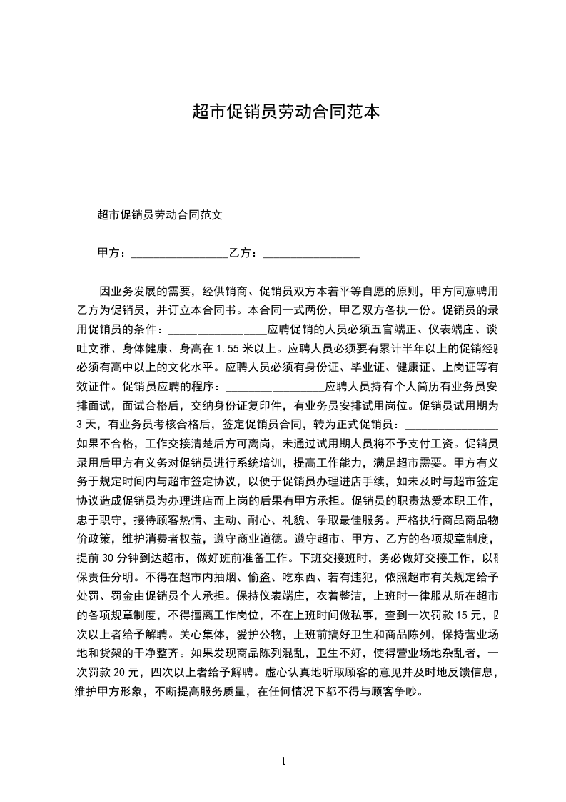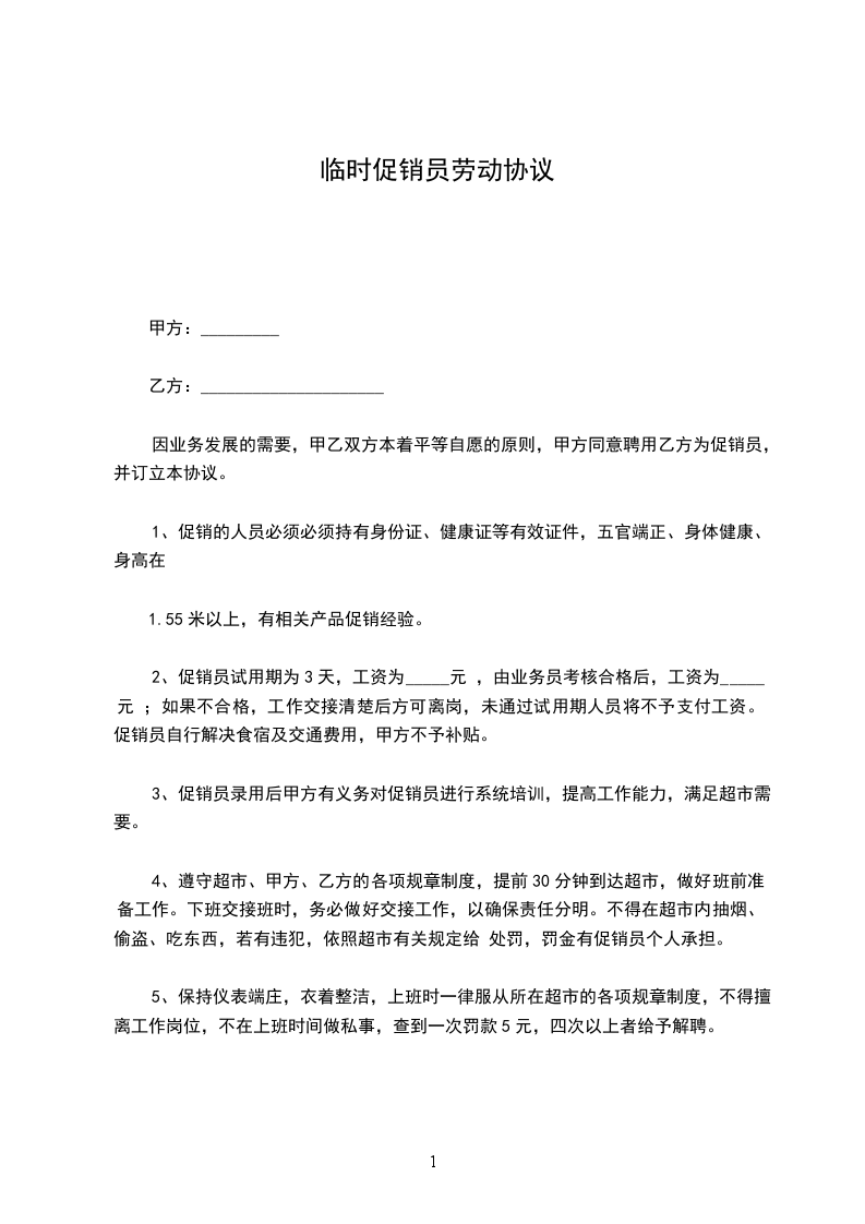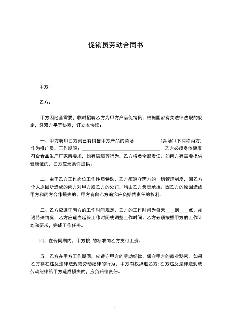 一、甲方聘用乙方到已有销售甲方产品的商场 _________(卖场)(下简称丙方)作为推广员,工作期限:__________________________________ 乙方必须身体健康,符合食品生产厂家所要求,如有隐瞒等行为,乙方将负全部责任。如丙方有需要提供健康证的,乙方应无条件提供。