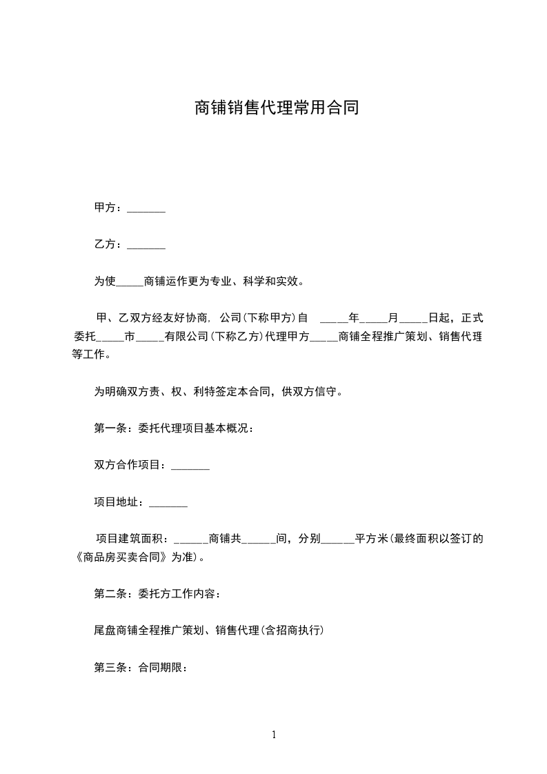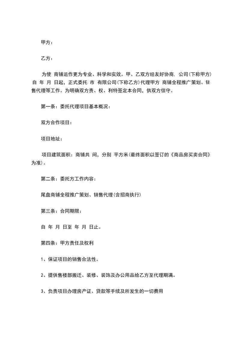 为使 商铺运作更为专业、科学和实效。甲、乙双方经友好协商, 公司(下称甲方)自 年 月 日起,正式委托 市 有限公司(下称乙方)代理甲方 商铺全程推广策划、销售代理等工作。为明确双方责、权、利特签定本合同,供双方信守。