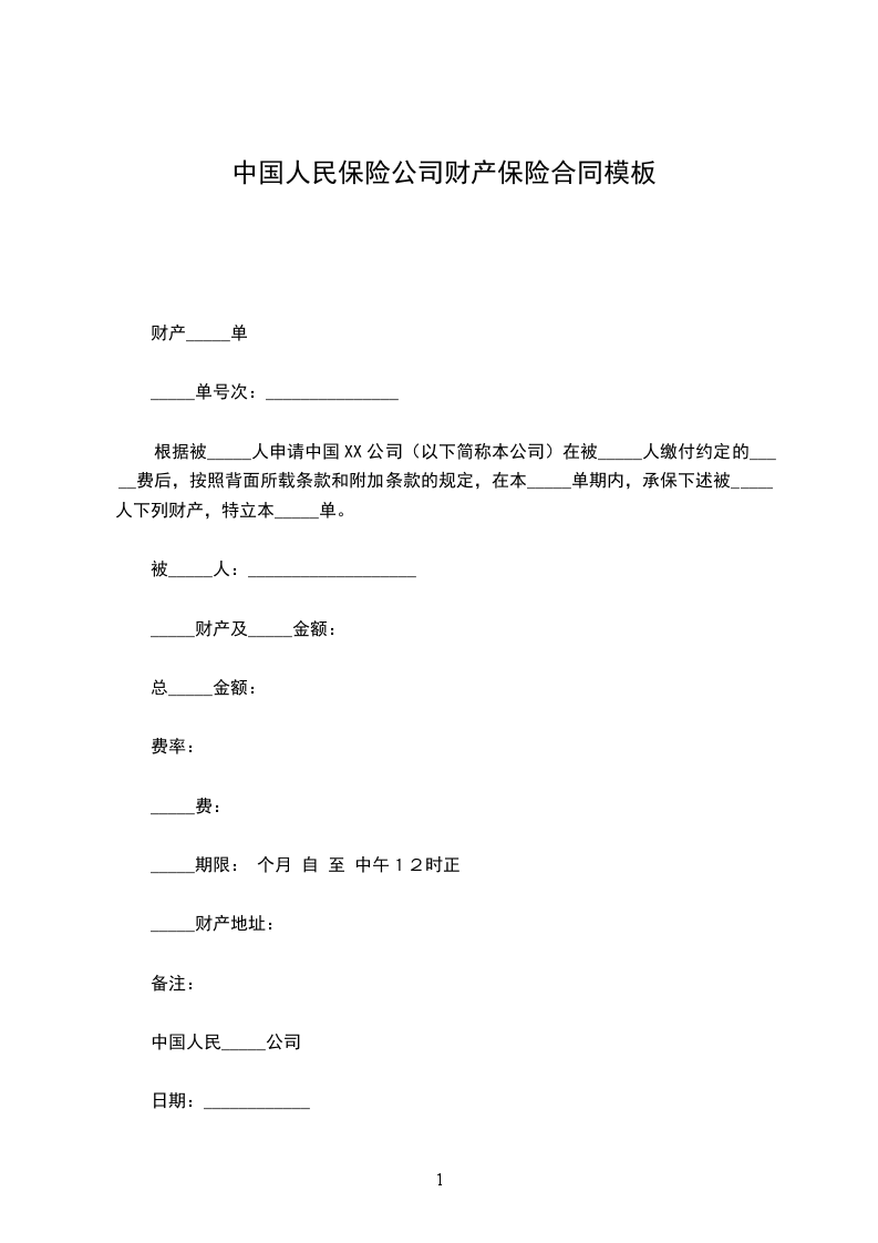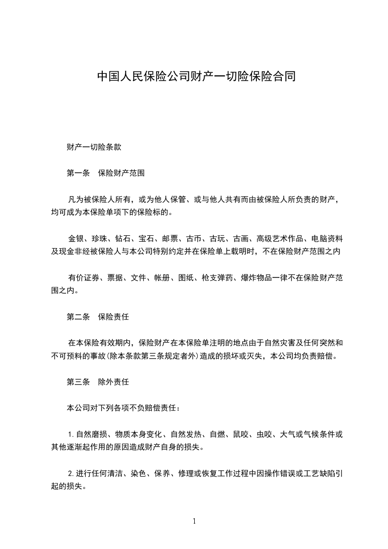 根据被保险人的申请,中国人民保险公司(以下简称本公司)在被保险人缴付约定的保险费后,按照背面所载条款、附加条款或批单的规定,在本保险期限内,承保明细表中所列被保险人财产的一切险,
