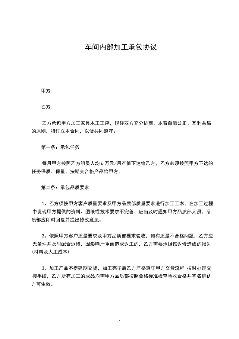 乙方承包甲方加工家具木工工序,现经双方充分协商,本着自愿公正、互利共赢的原则,特订立本合同,以便共同遵守。