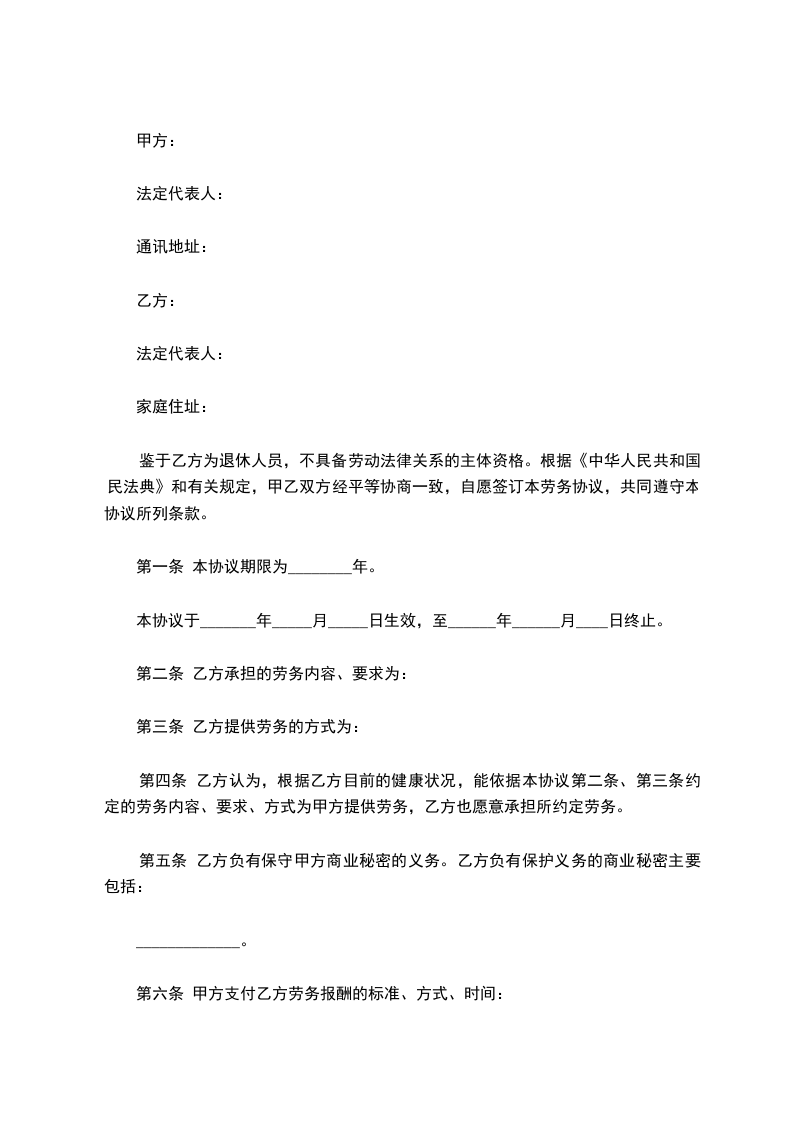 鉴于乙方为退休人员,不具备劳动法律关系的主体资格。根据《中华人民共和国民法典》和有关规定,甲乙双方经平等协商一致,自愿签订本劳务协议,共同遵守本协议所列条款。